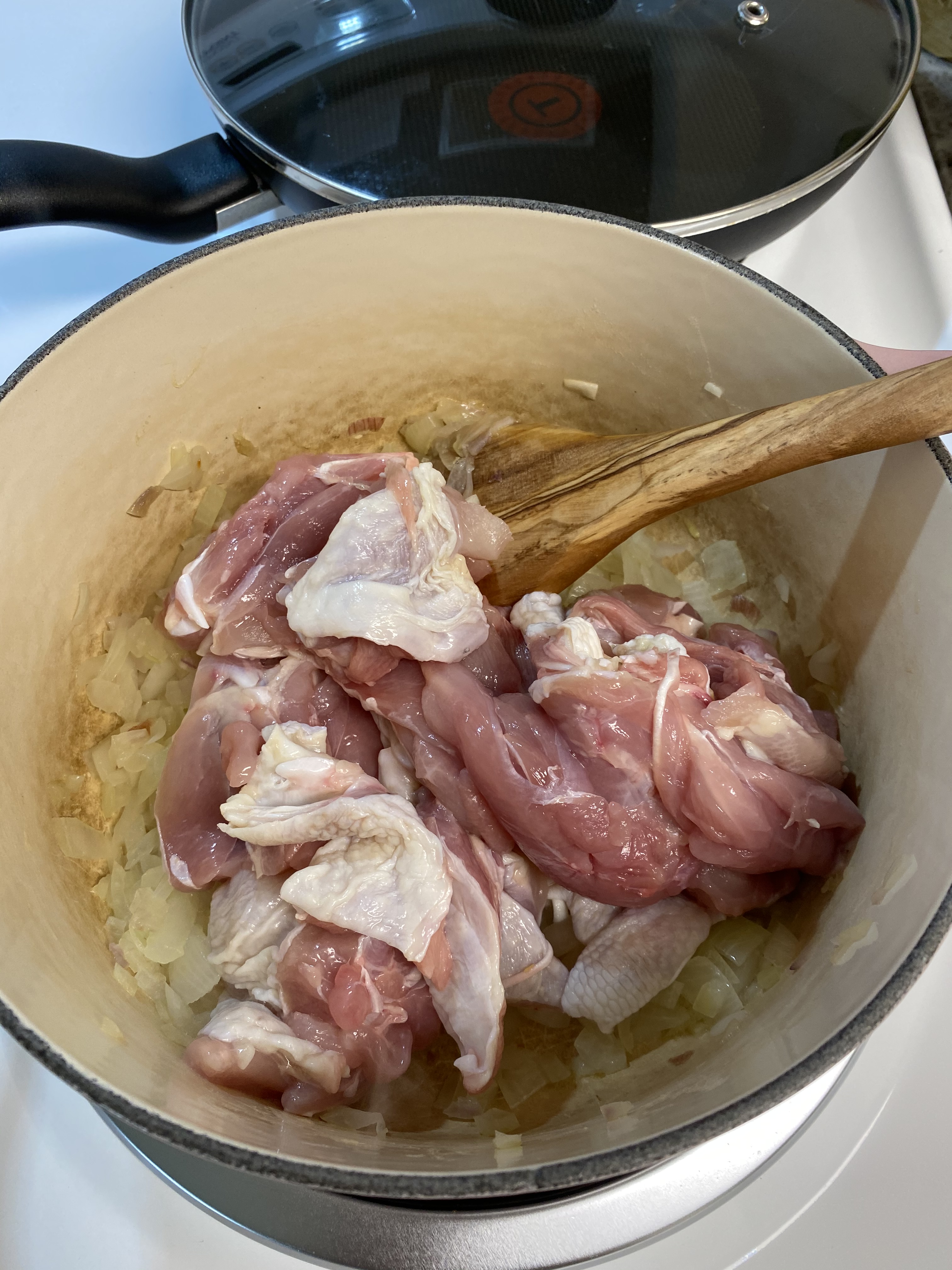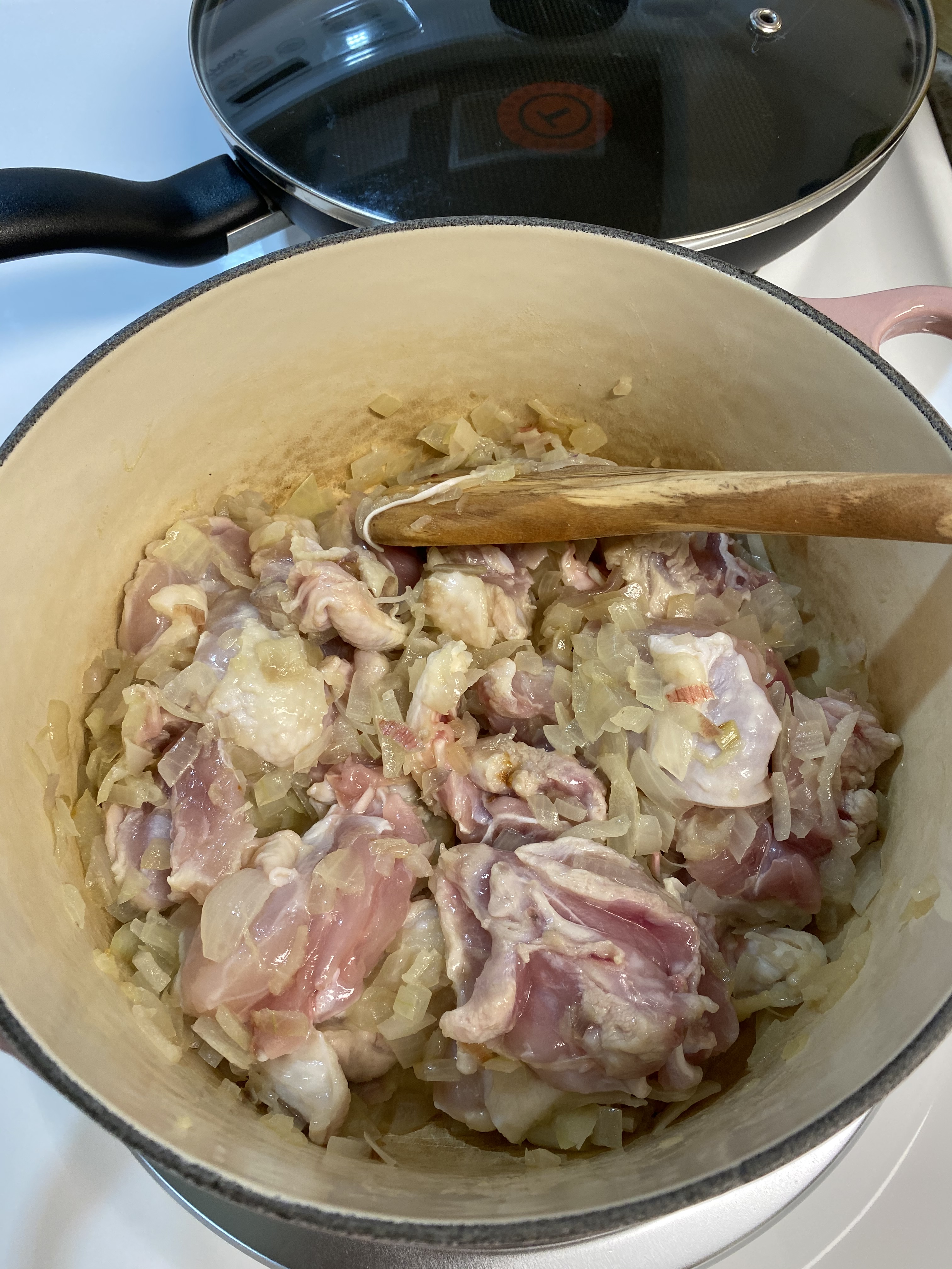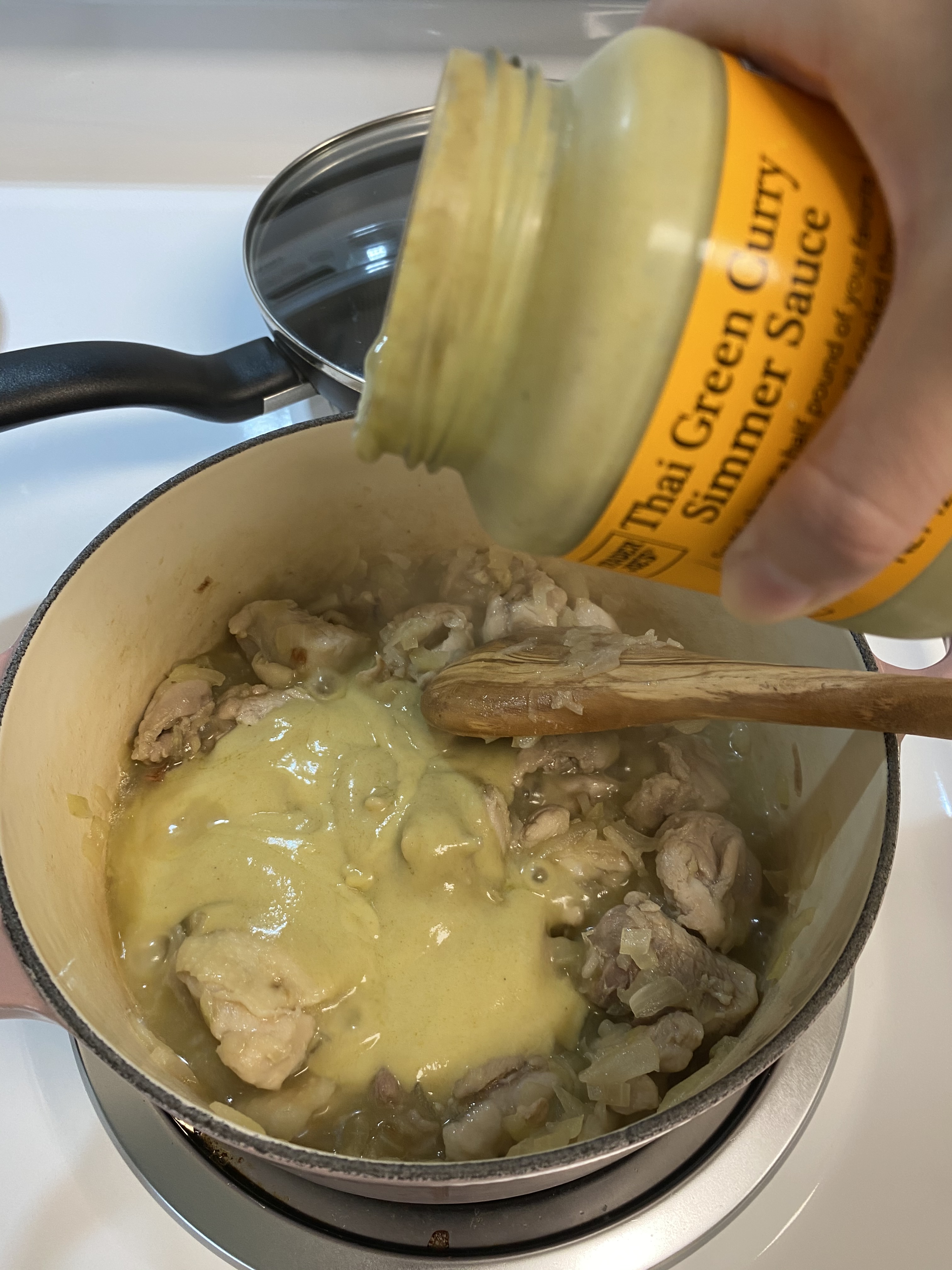 紅蔥頭和洋蔥炒香後把去骨雞腿放入鍋中拌炒,炒至雞肉表面都呈現白色,把綠咖哩整罐倒入鍋中(這時可以用湯匙嘗嘗味道,覺得太鹹再加水,我大約加了半碗),煮到醬汁滾後放入節瓜稍微拌煮五分鐘 。