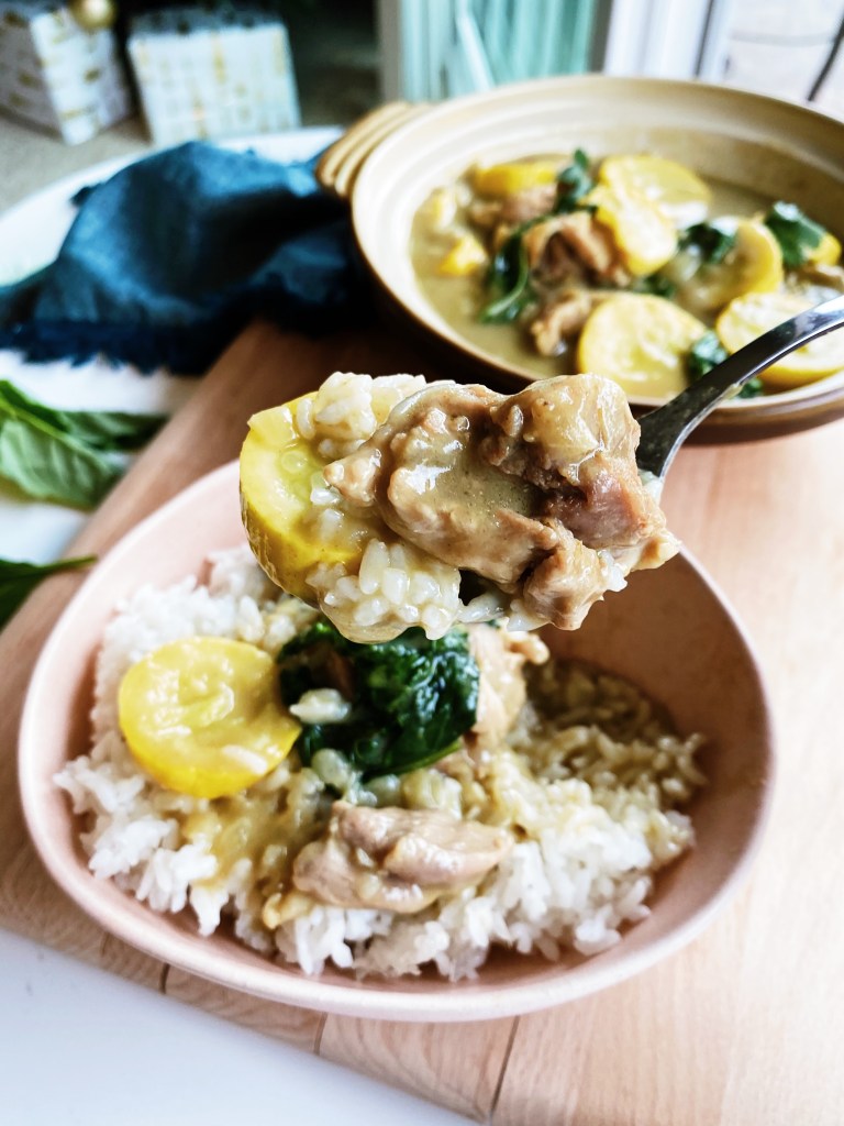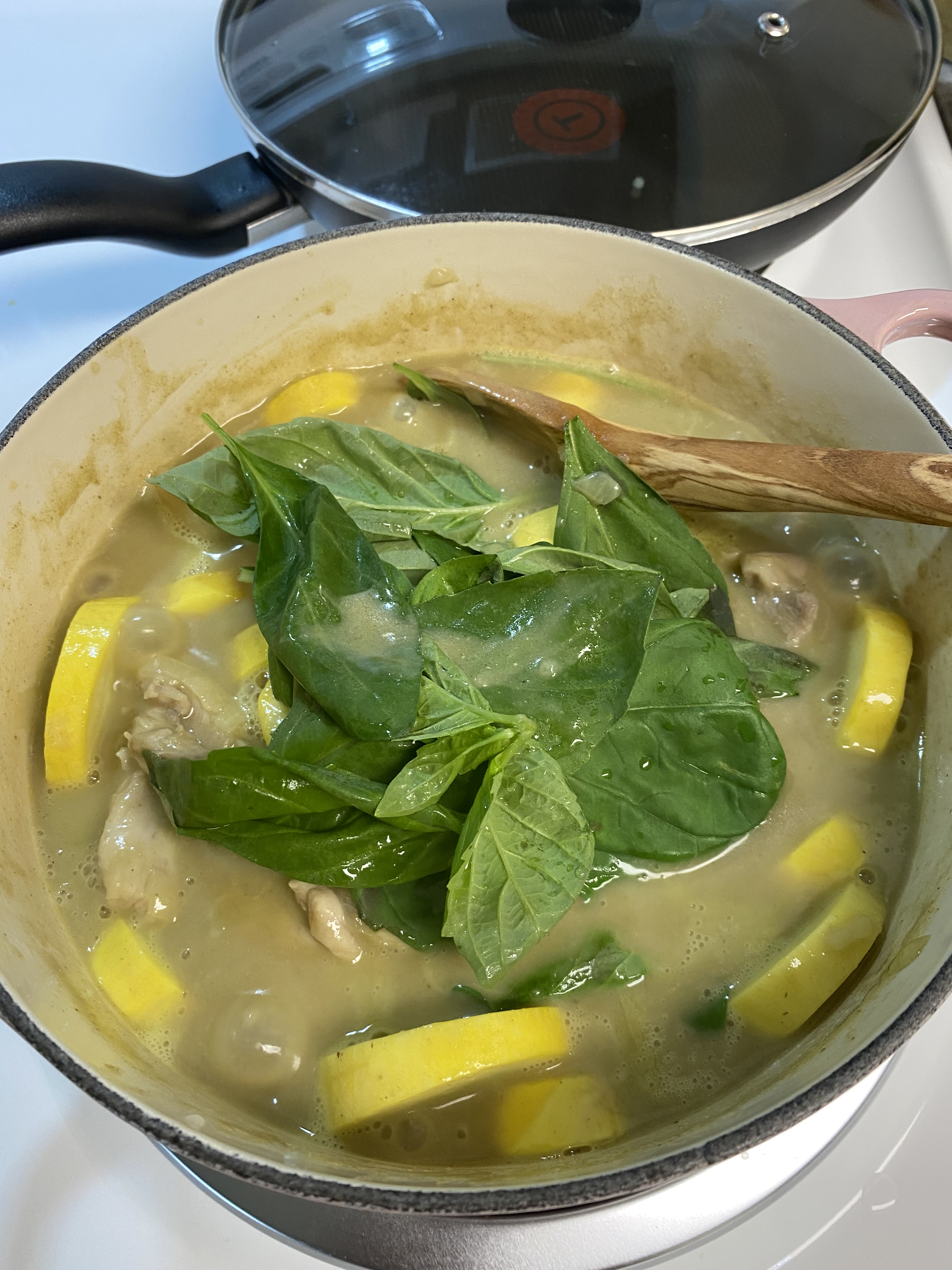 ➔ 最後熄火放蘿勒葉悶20秒,開蓋攪拌均勻,簡單美味又快速的綠咖哩雞完成了!