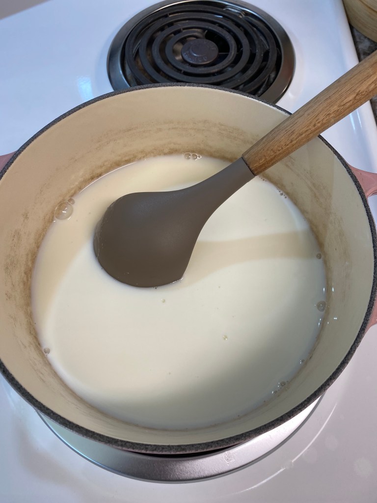 開中火將鮮奶倒入鍋中,並放入砂糖、鹽攪拌均勻。