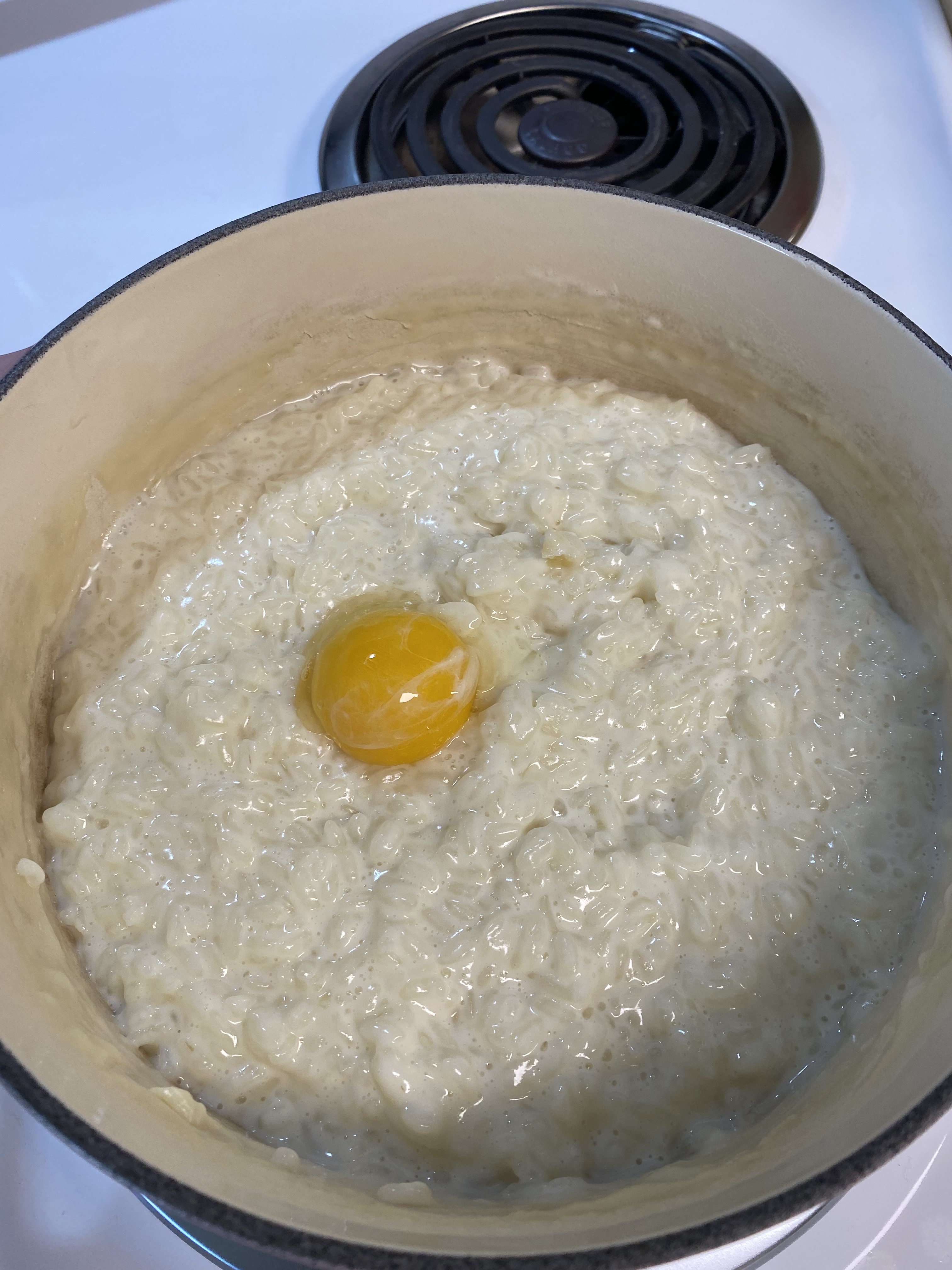 一直煮到試吃一口米粒軟硬度差不多,米心都軟了,就可以熄火,滴入香草精、蛋黃、肉桂粉攪拌均勻,(喜歡味道更濃郁的可以再加入一點點奶油~)
