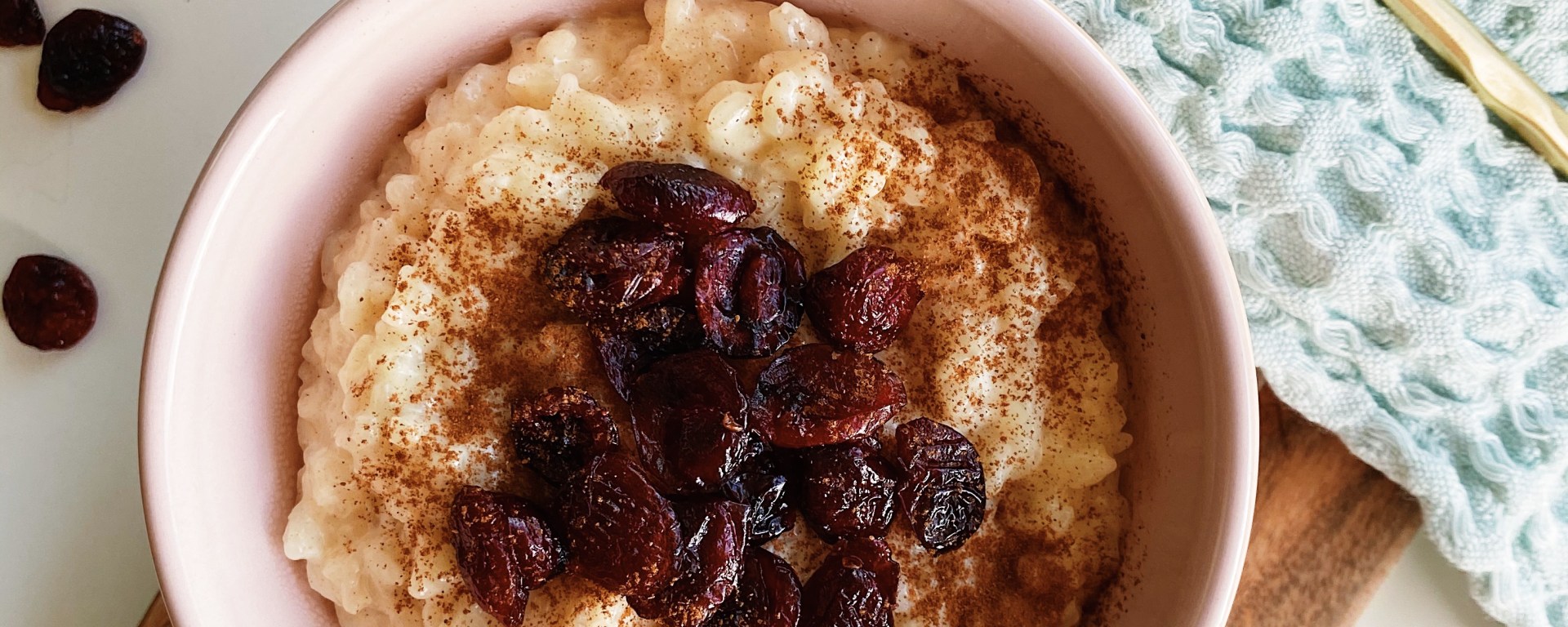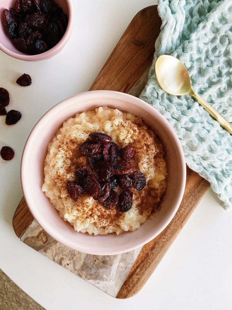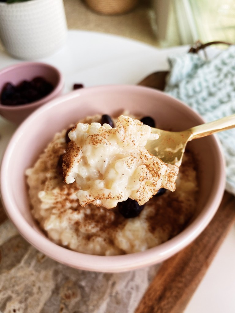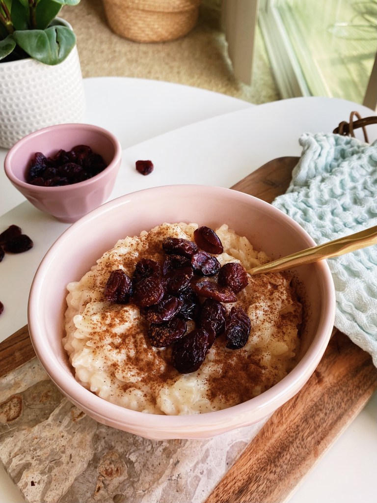所以米布丁到底怎麼個好吃法呢?首先它是用牛奶、砂糖、香草小火慢燉而成的,煮出的米彈牙而且帶有濃郁的奶香~吃進去的每一口米粒都包覆著香草的香氣,我覺得它就是甜版的燉飯!吃之前還可以灑上我最愛的肉桂粉和喜歡的果乾,這次我用的是蔓越莓乾,一口甜甜的奶香米粒配上一口微酸的果乾,這道家常平凡甜點意外的讓人驚喜!