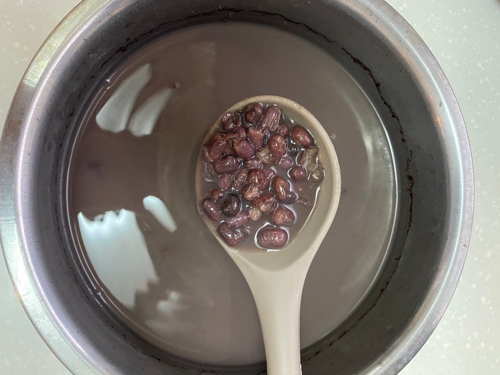 把紅豆泡過放至隔夜,隔日用電鍋蒸至軟爛。