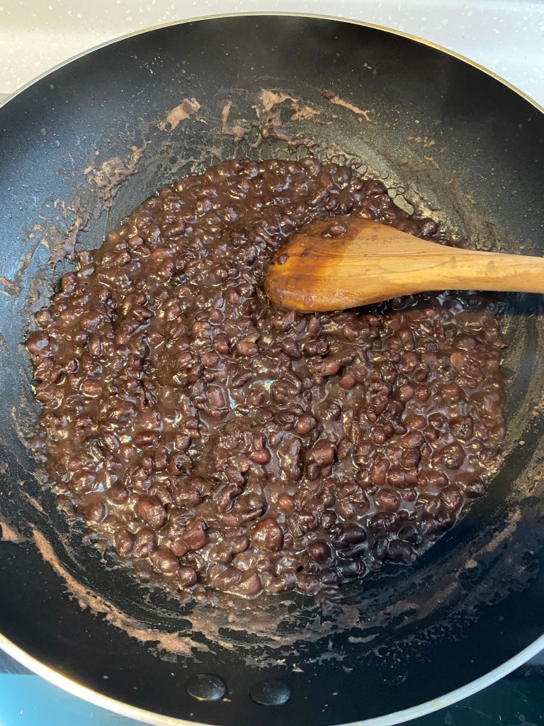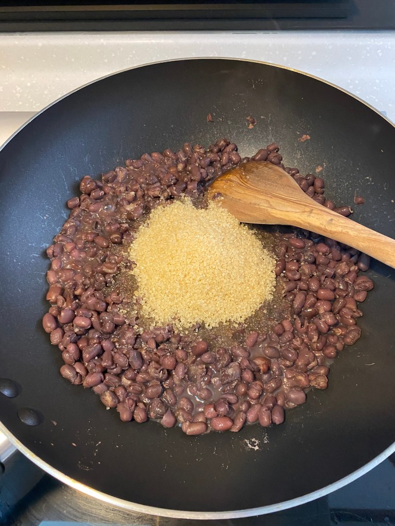 把紅豆的水瀝掉備用,將紅豆放置平底鍋用中小火拌炒,並加入砂糖。