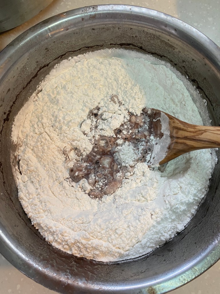 在一個盆中倒入糯米粉,並將剛剛備用的紅豆水加入鍋中拌勻。