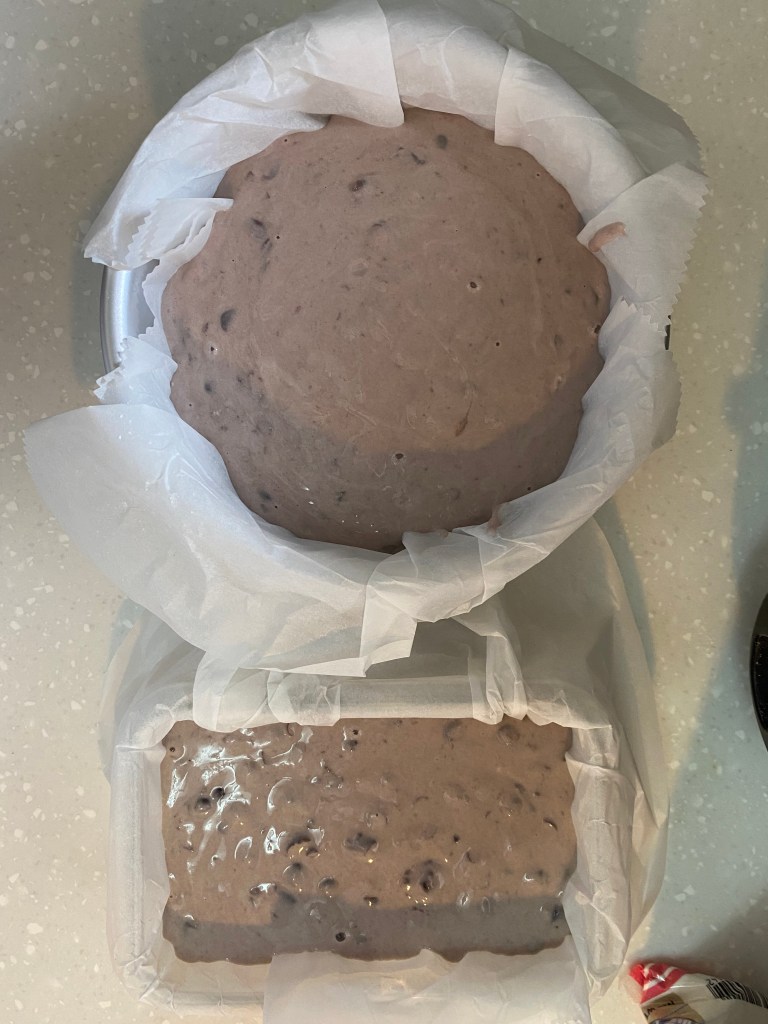 用烤盤紙襯在容器底下,把粉漿倒入,用電鍋蒸1小時整,記得要計時哦!我用一個圓的一個長方形的,(這樣拍照起來漂亮、送人也可以兩種選擇。)