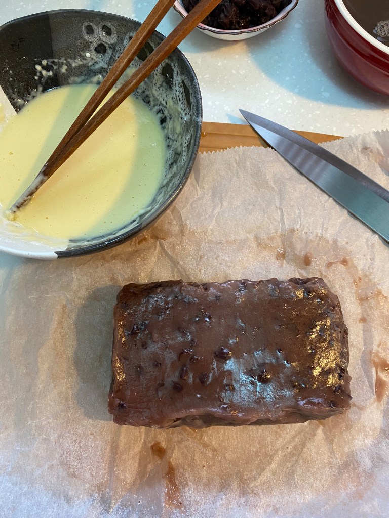 ★ ★ 蒸好之後一定要放涼在脫模,接著在用一顆蛋+麵粉調成粉漿,把紅豆年糕切片,裹上粉漿,放入平底鍋煎至雙面金黃。