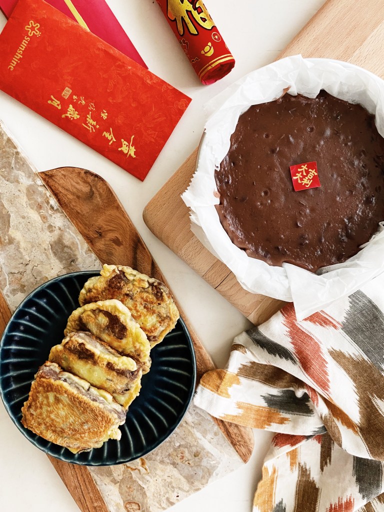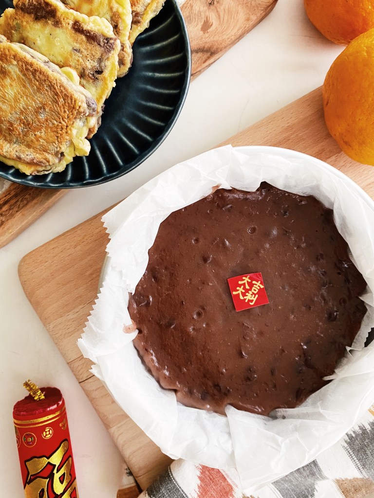 而除了費工的年菜之外,年節的甜點也是我從小必吃的!其中甜年糕絕對是我的最最最愛❤️❤️❤️!(我媽知道我愛吃,去年來美國時她還在我箱子裡塞了一塊年糕),以前每年的過年吃著外婆親手做的黑糖年糕,我超愛那甜甜軟Q的口感,煎過之後外酥內軟又香濃,今年我自己也上網學著紅豆年糕,步驟很少做起很容易,失敗率超低,首次挑戰年糕成果我超級滿意!