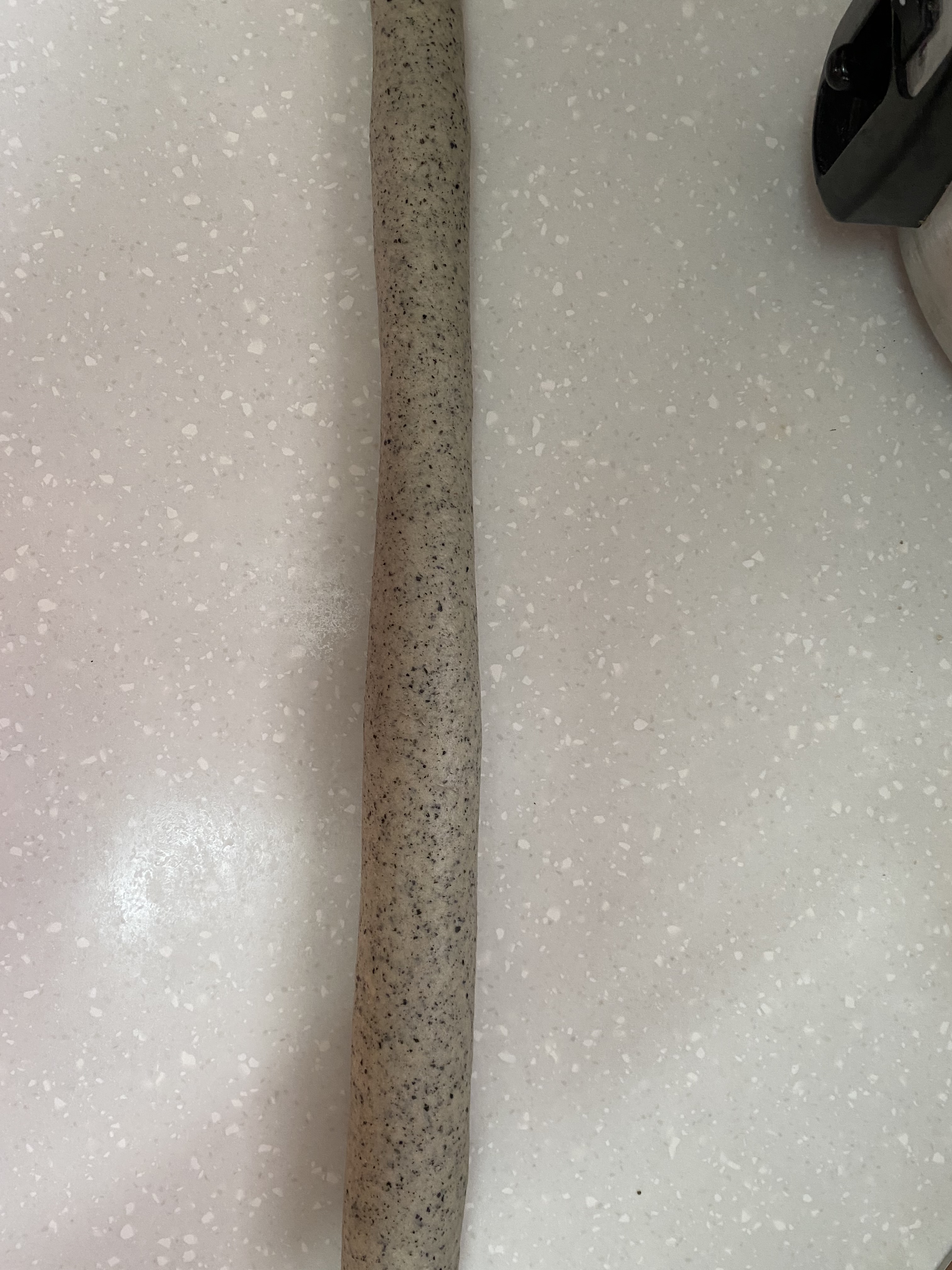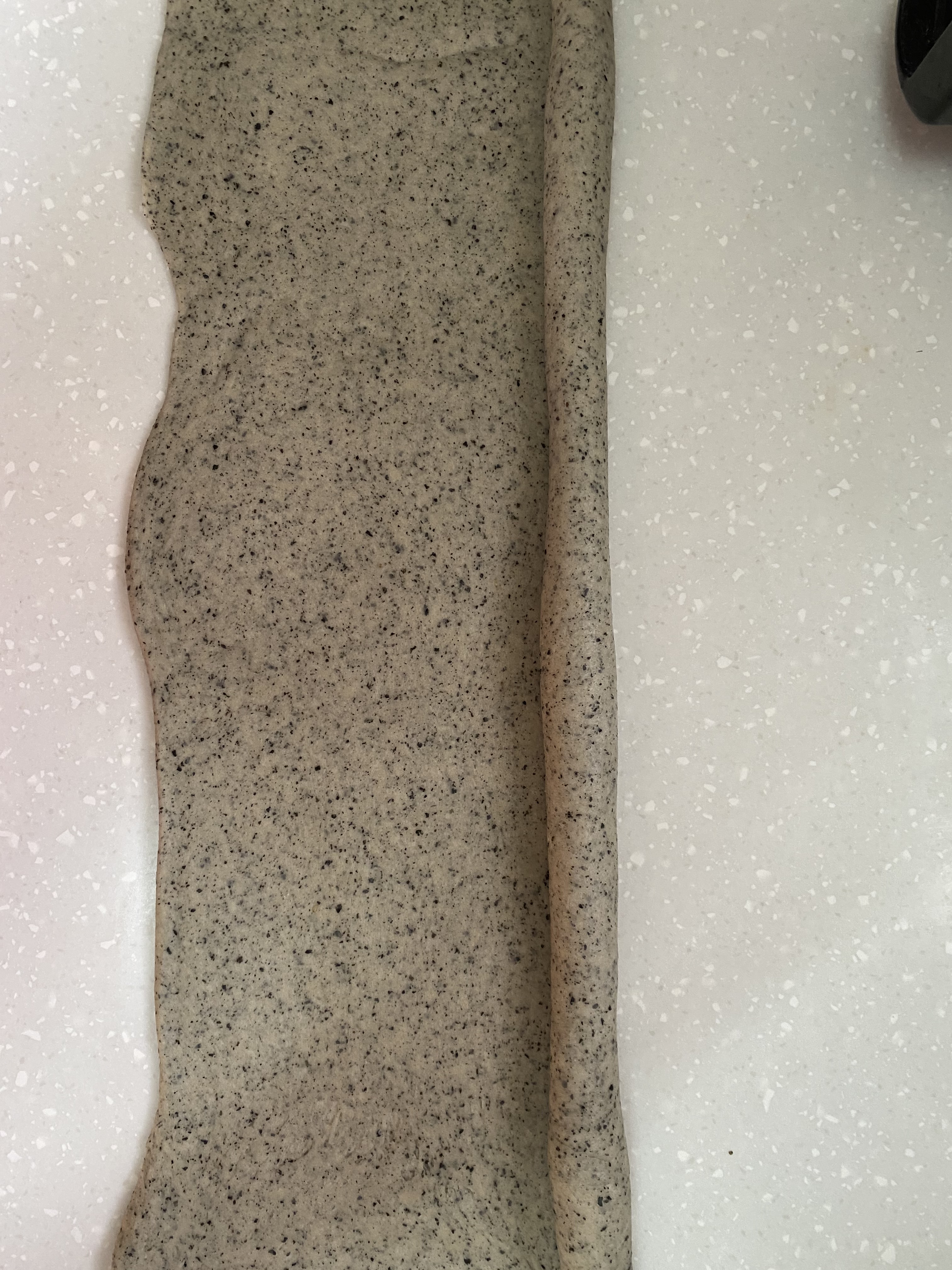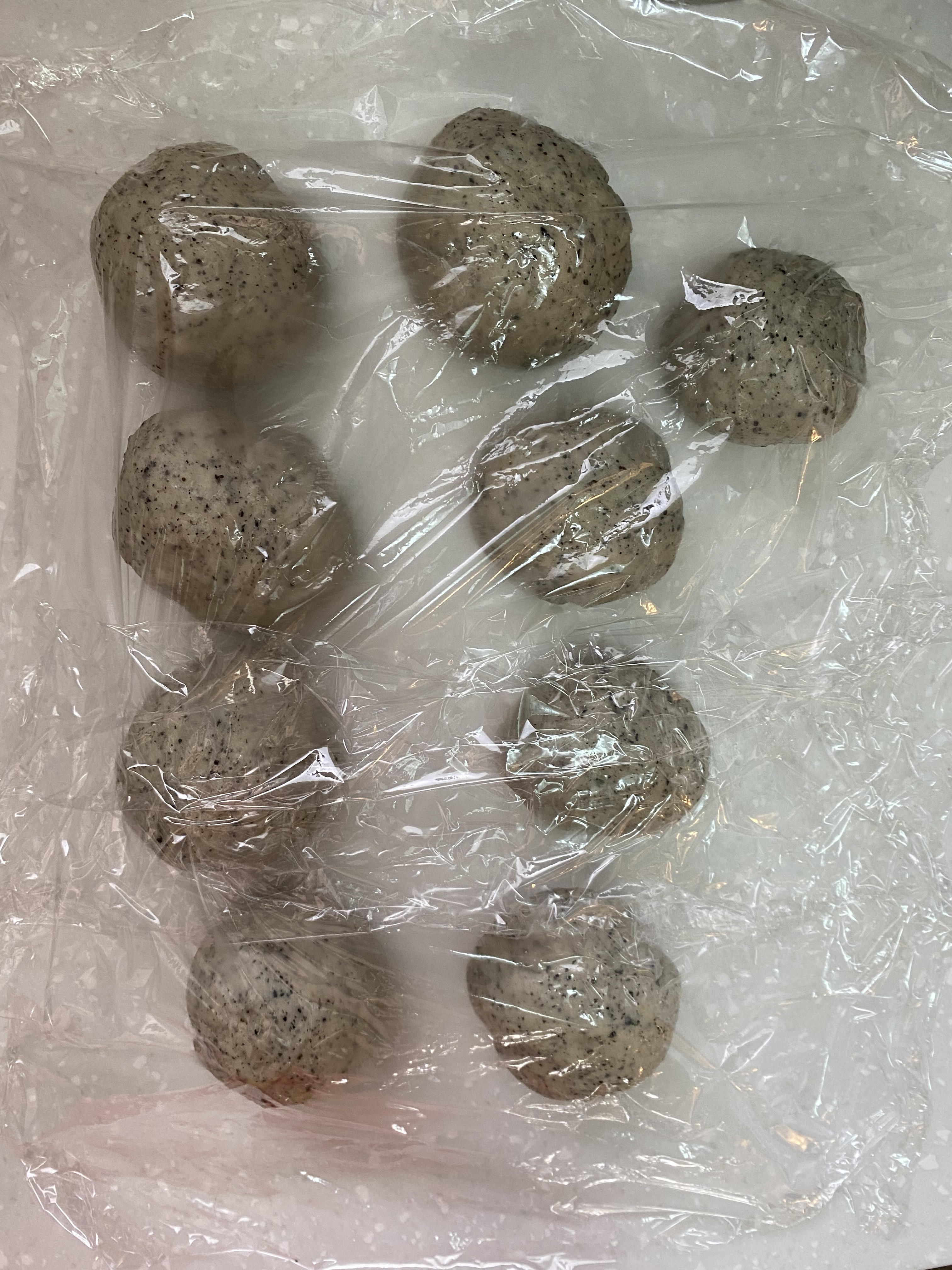 重複三次後,把麵團桿開成一大張長方形,然後捲成條狀,切成一塊塊小麵團,滾成一個個小圓麵團,光滑面朝上,蓋上保鮮膜,醒15分鐘。