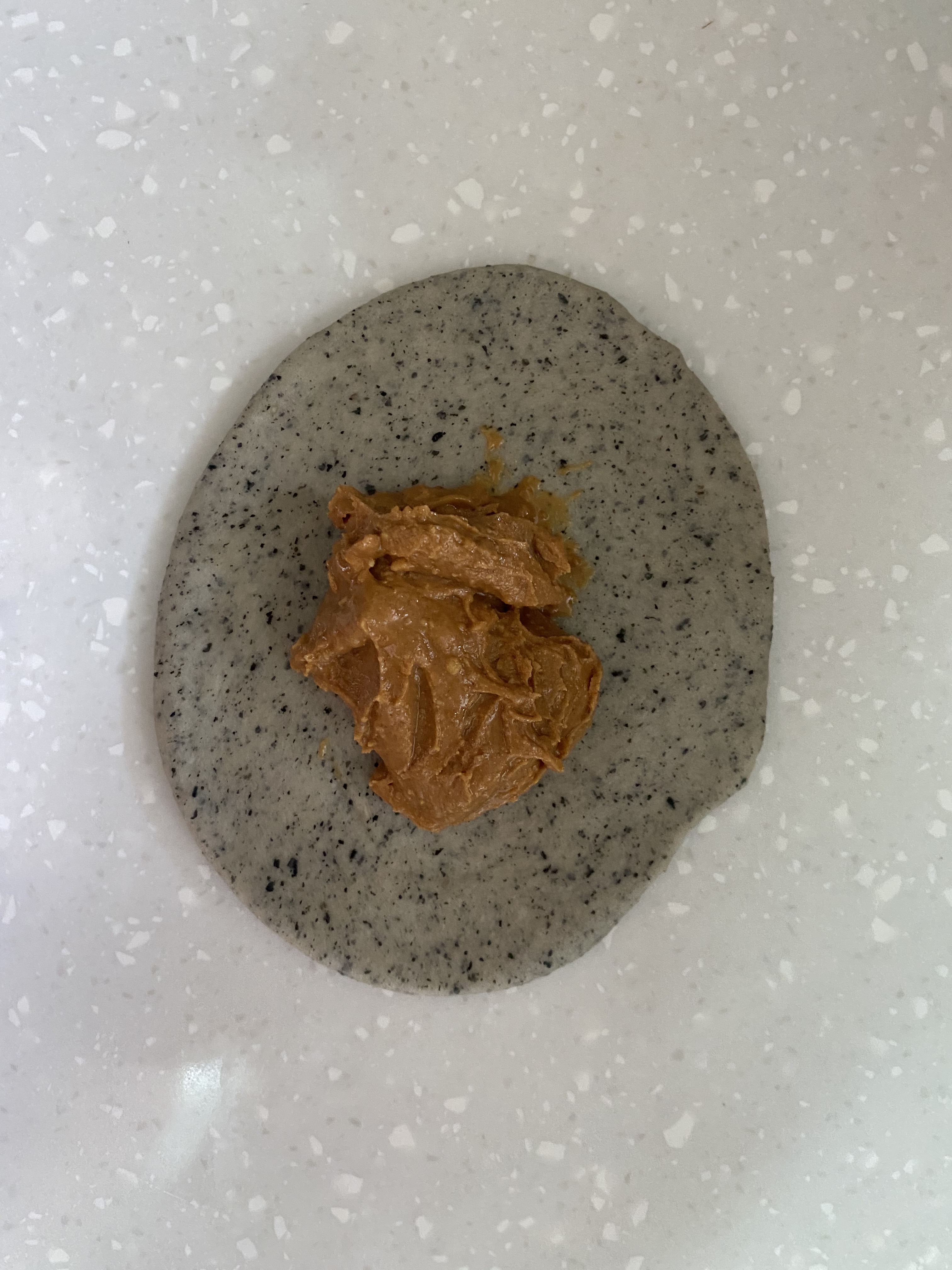 接著進入最後步驟,把剛剛冰在冰箱的芝麻餡拿出來,舀上一大湯匙,放在桿好的麵皮上,花生醬也是。