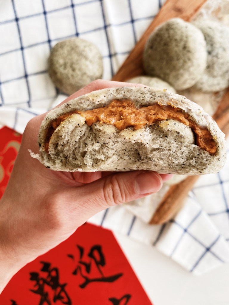 記得小時候過年期間必吃的零食之一芝麻糖、花生糖,現在隔離期間吃不到,我就用芝麻粉來做成芝麻包!少了傳統芝麻糖的硬和黏牙,多了像流沙般的芝麻內餡和包子皮的鬆軟香甜!大口咬下去包子口感紮實、芝麻的香氣超濃郁,我不愛芝麻糊,但芝麻湯圓或是做成芝麻包子很可以~🤤