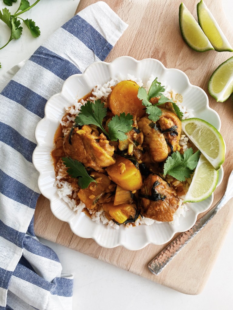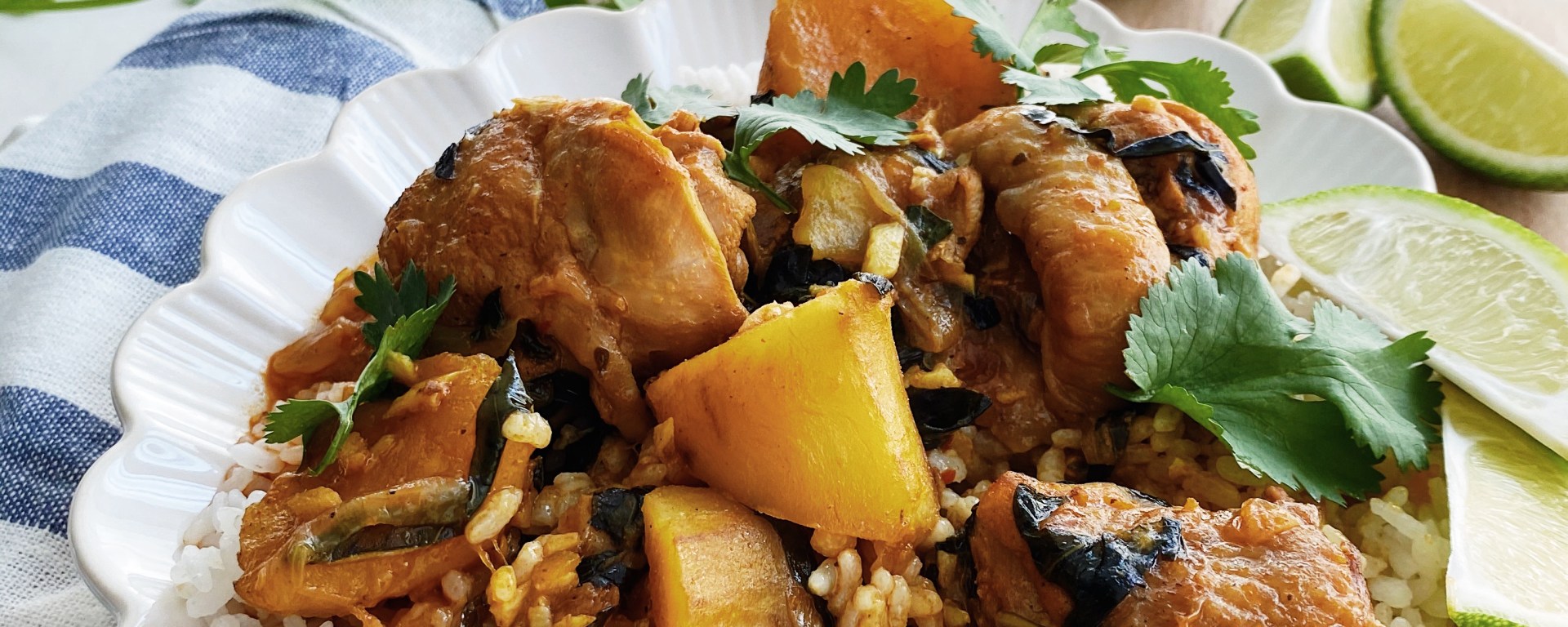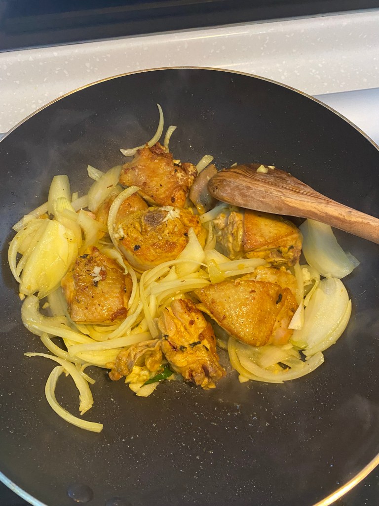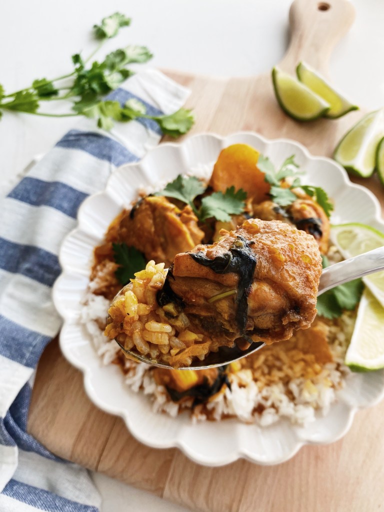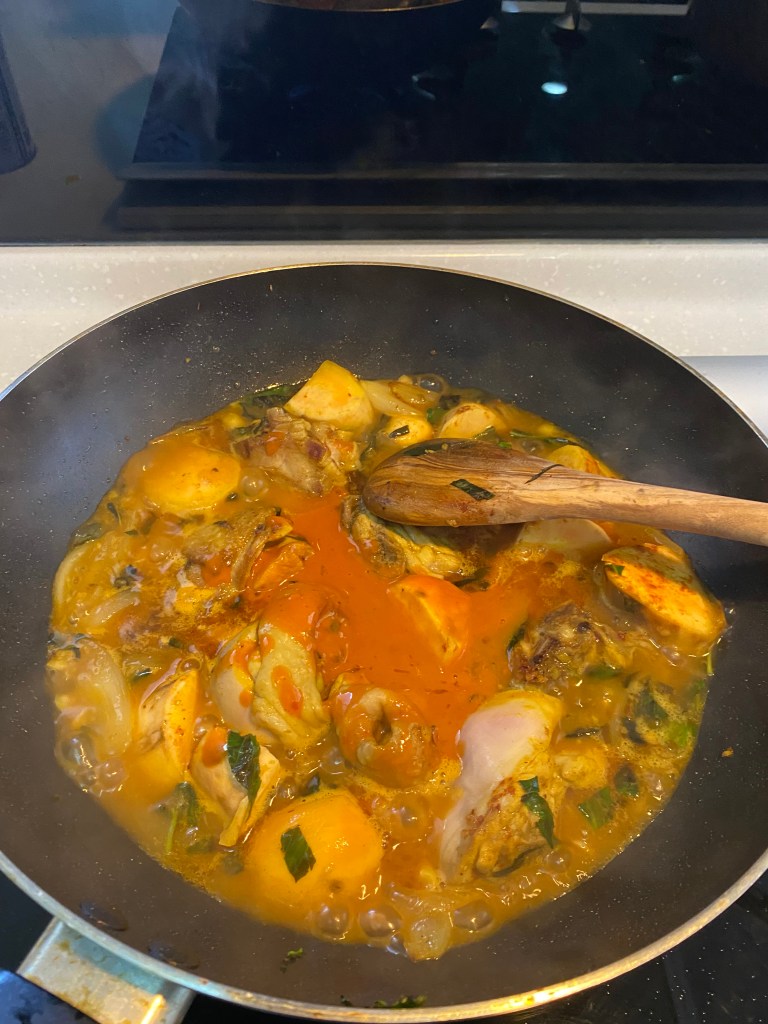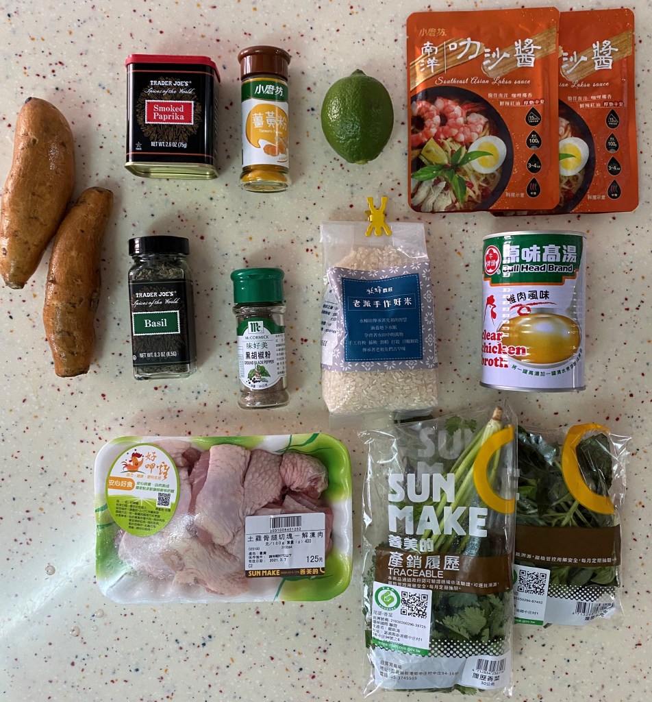 煮法很簡單,我用薑黃粉和胡椒先抓醃過雞腿肉,用地瓜取代馬鈴薯、在鍋中放入炒過的雞腿、洋蔥、算、九層塔,最後放入地瓜一起用高湯跟叻沙醬一起燉煮20分鐘,當然想要更省時間可以直接加入醬包煮,但我喜歡整體吃起來的湯汁味道更豐厚,所以還是先炒過佐料,整個過程30分鐘左右搞定!吃之前再淋一點新鮮的檸檬🍋🥘~酸酸辣辣超開胃,米粒吸附了叻沙醬汁的鮮甜香料味,配上煮的夠入味雞腿肉、綿密的地瓜,每一口的香氣都好濃郁~