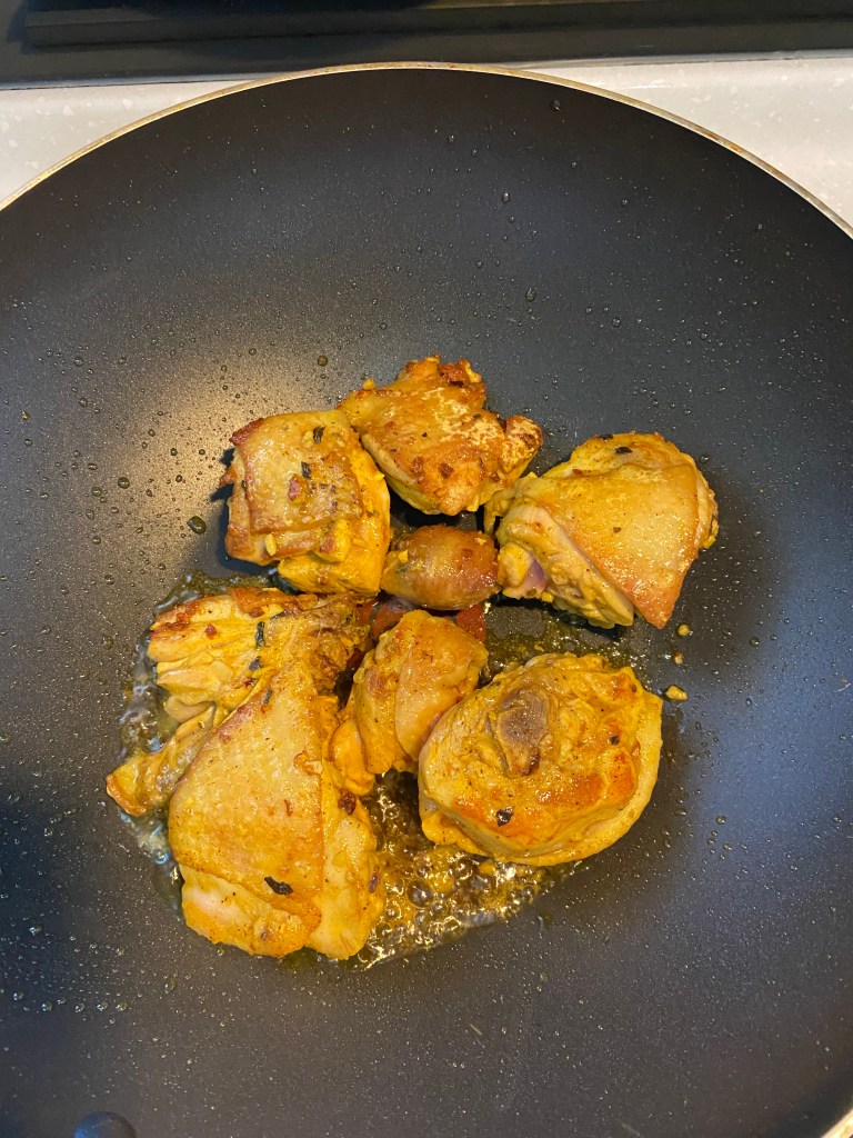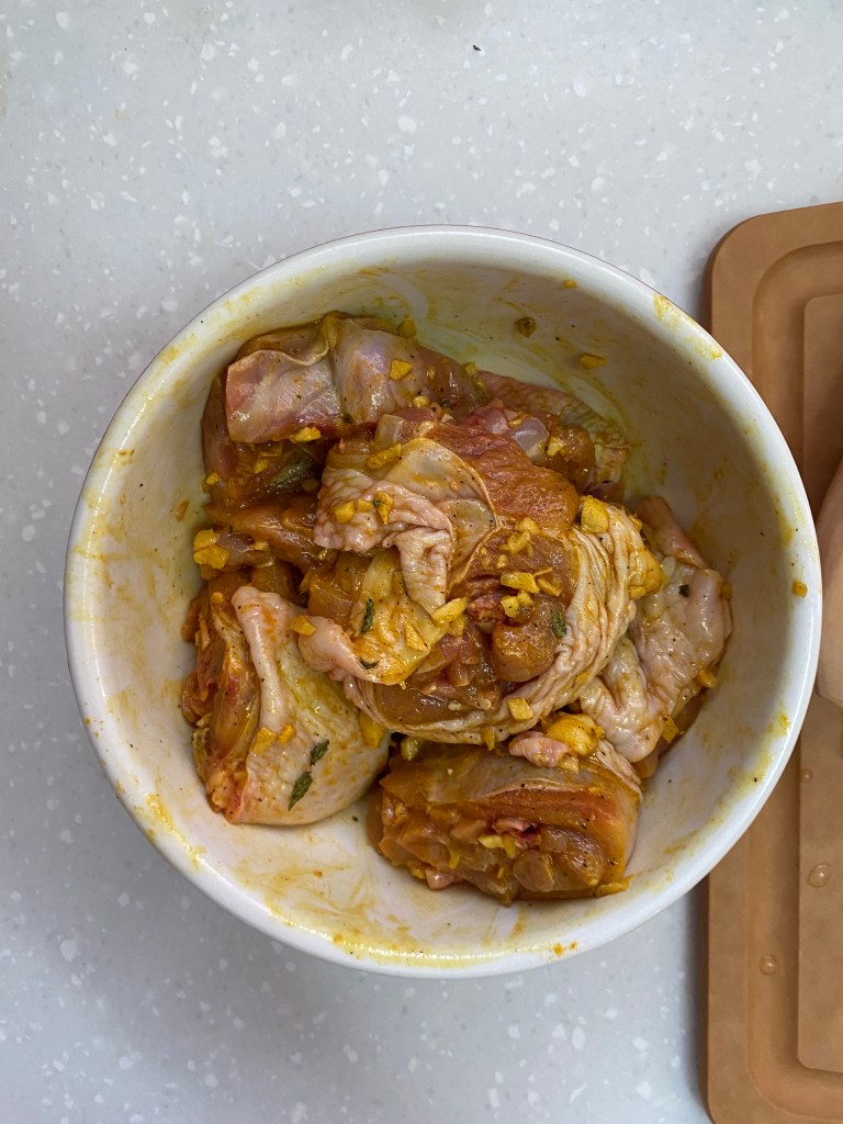 雞腿肉用麻油、薑黃粉、薑末、黑胡椒抓醃10分鐘左右。