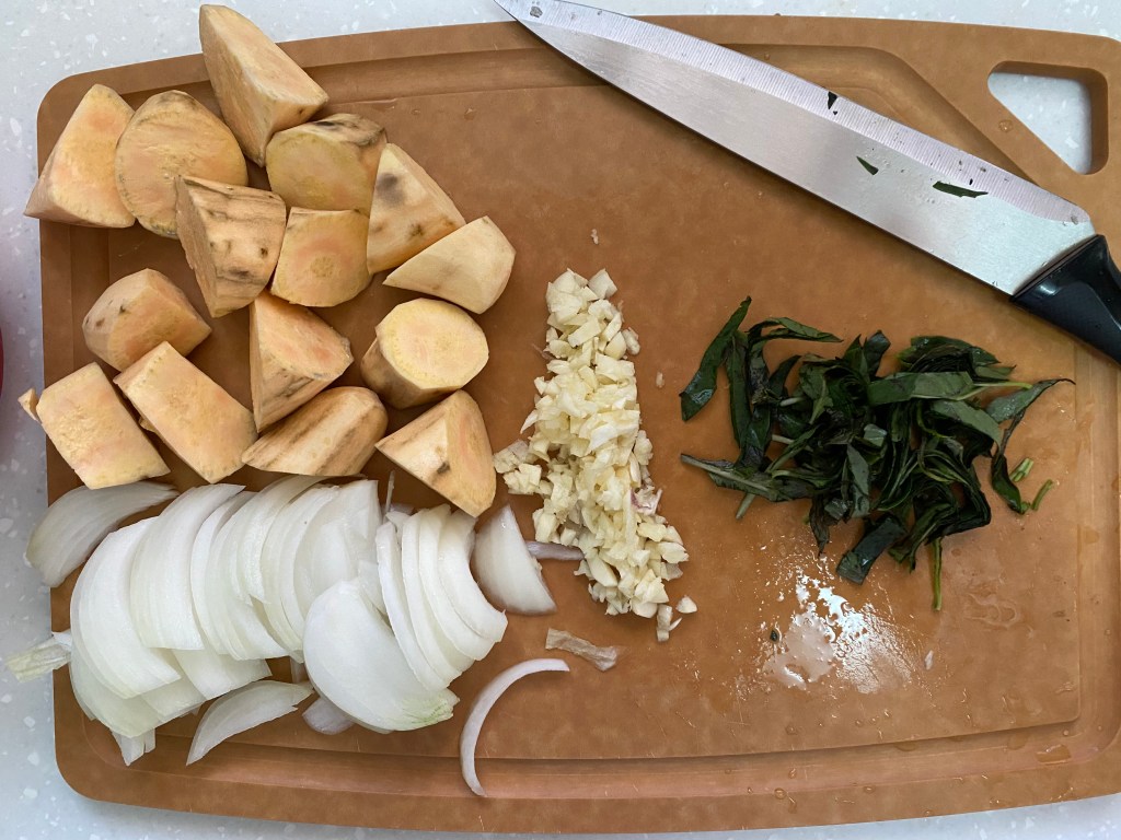把地瓜滾刀切塊、蒜切末、九層塔切碎、洋蔥切片,等等備用。