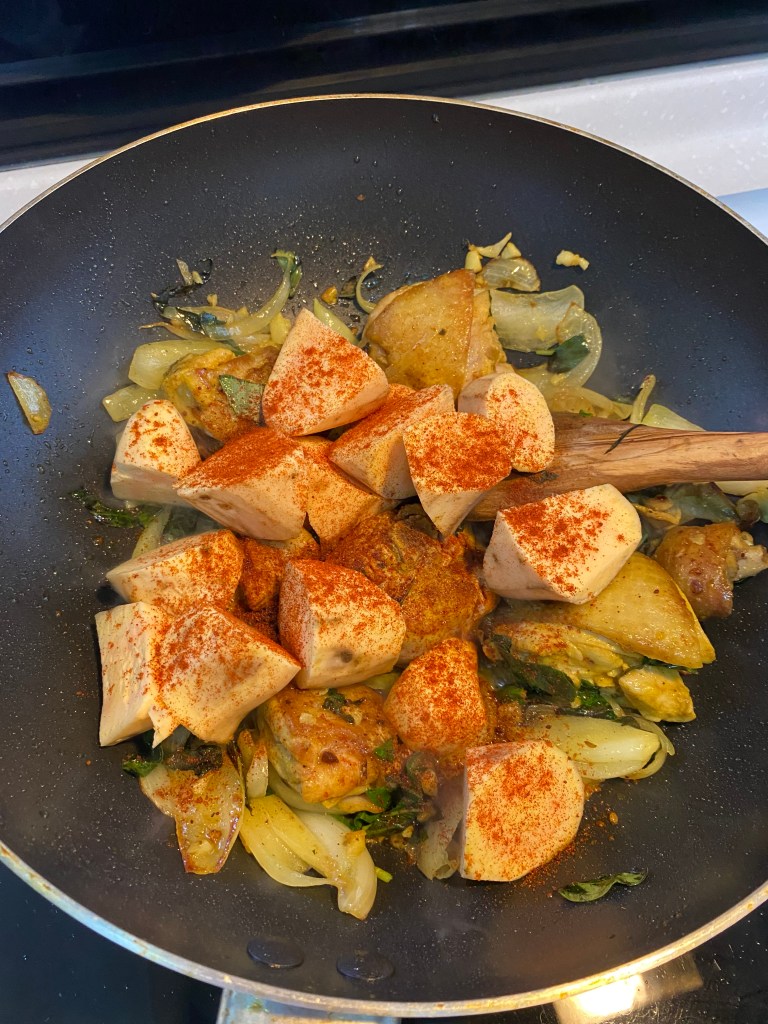 放入地瓜、並撒入少許紅椒粉讓味道更豐富,一起拌炒開來。