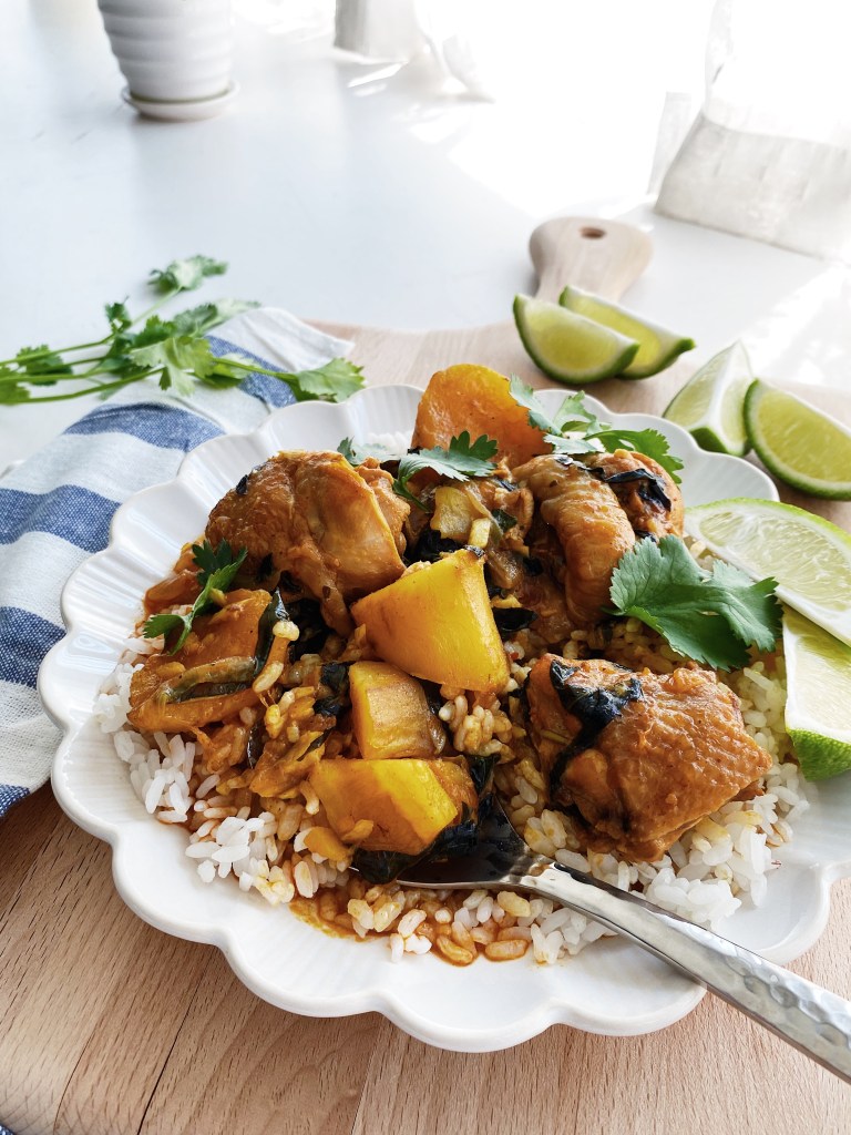➔ 時間到打開鍋蓋,搓一下地瓜已經變綿了、湯汁也變濃稠,就可以關火盛盤,酸辣夠味的南洋風 叻沙地瓜雞肉飯完成啦!