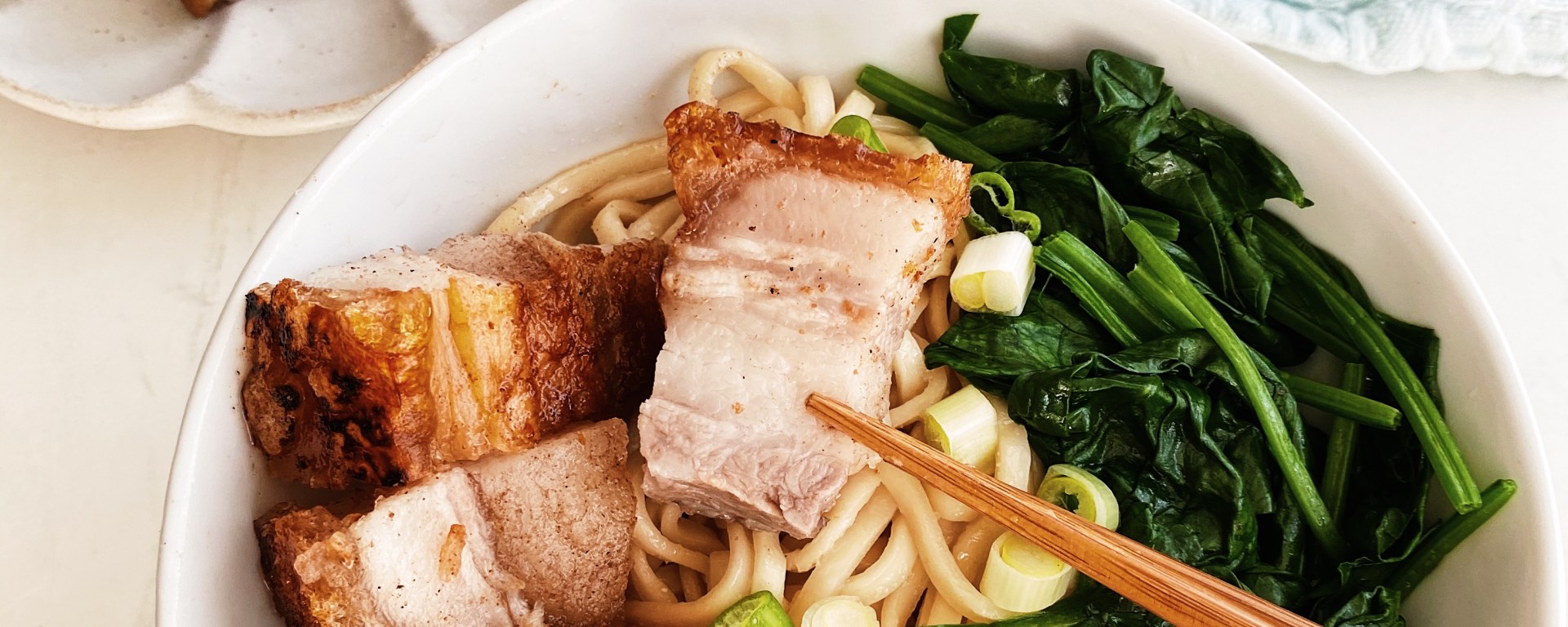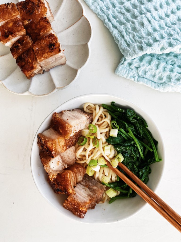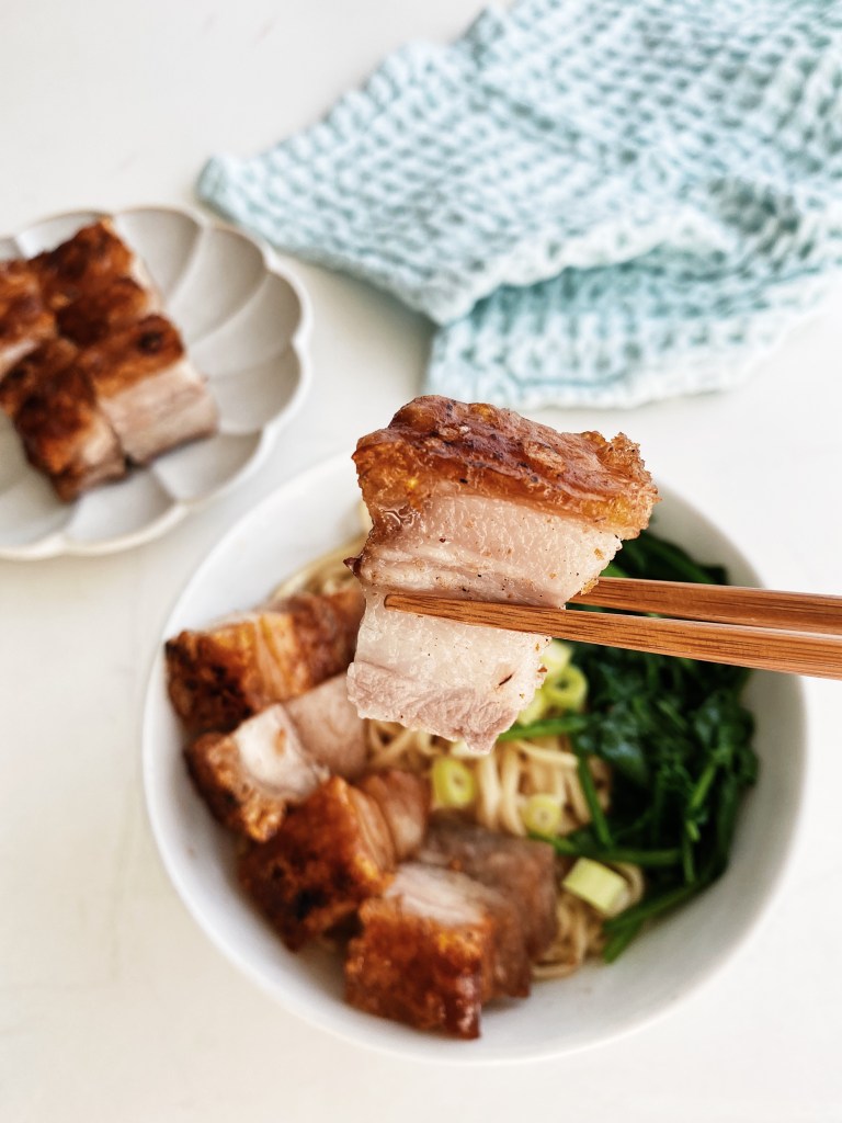 ➔ 最後煮一把麵,燙一點青菜,家裡自製的脆皮燒肉麵就完成了!!脆皮的部分真的是酥脆到不行,烤的過程中就一直撲鼻而來陣陣的豬肉香,等不及盛盤了,再切的過程裡就一直偷吃~