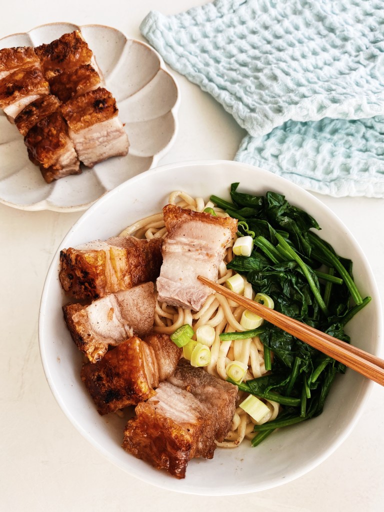總之,自己在家做的脆皮燒肉非常酥脆多汁~花的時間很多,前一天晚上就要先醃過,花的時間多但美味是相對的!烤的豬皮金黃酥脆、肉質軟嫩多汁,配上我煮簡單乾麵和一把菠菜就是超美味超開胃的脆皮燒肉麵!🍖🍜