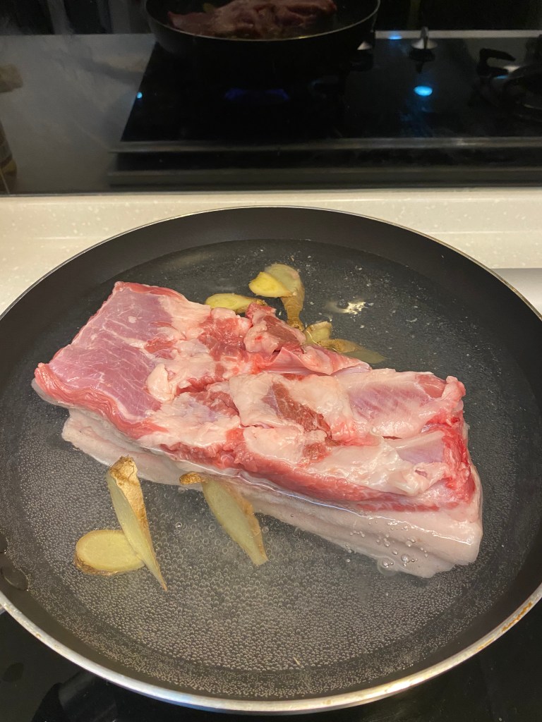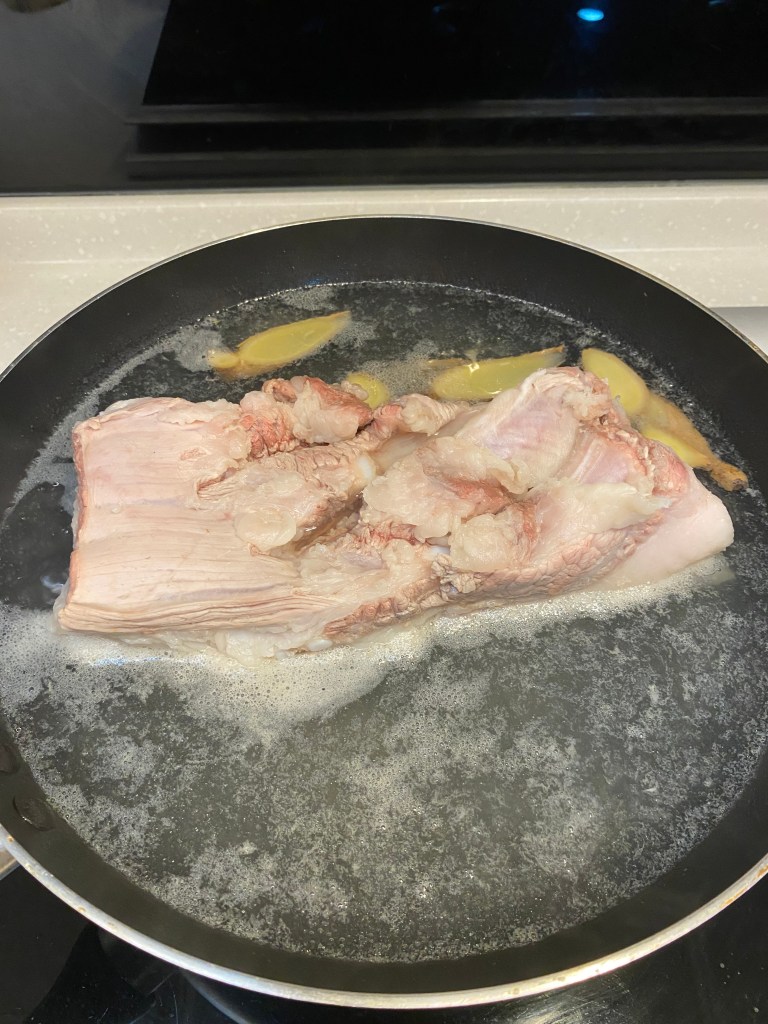煮一鍋滾水,放入薑片,水滾後豬皮朝下放置鍋中煮,小火煮30分鐘左右。