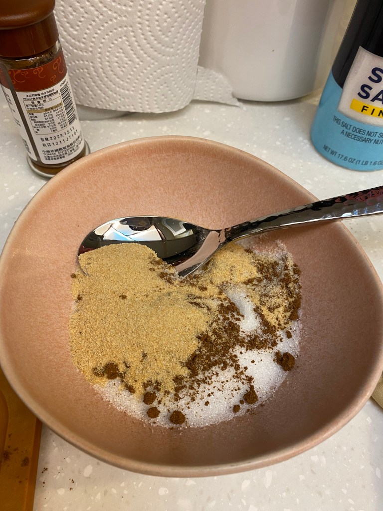 然後調一小碗香料鹽,放入鹽、砂糖、五香粉、香蒜粉。