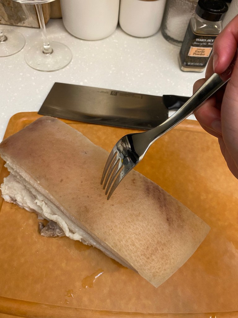 沖洗乾淨後,用菜刀輕輕的來回刮一下豬皮表面 (不能太大力刮哦~) ,然後再用叉子反覆叉豬皮表面,每個地方都不要漏掉。