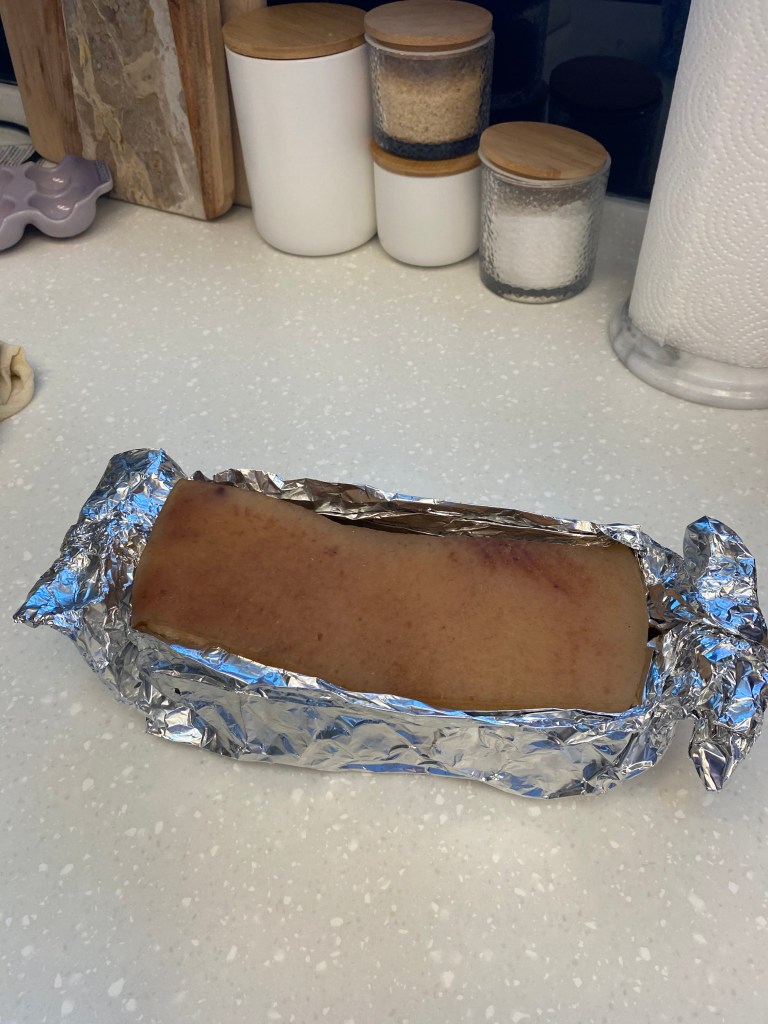隔天拿出來,用鋁箔紙把五花肉包成一個盒子狀,上面不要蓋到,把烤箱預熱 200°C烤20分鐘!