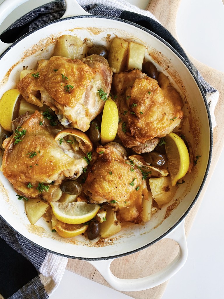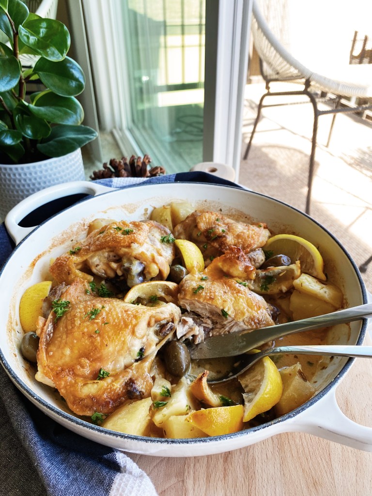 這道【馬鈴薯檸檬燉雞】是單鍋料裡書中一道很開胃的地中海料理,而且食材好簡單,雞腿肉、馬鈴薯、檸檬、橄欖,都是冰箱的常備食材,就可以在家裡輕鬆完成這道異國料理!檸檬酸酸的味道混合著雞汁和蒜香,舀一瓢被烤的吸飽湯汁軟綿的馬鈴薯😌,真的是香氣十足又清爽開胃!(好吃到我後悔只放4塊雞腿肉進去,應該塞到6隻的)