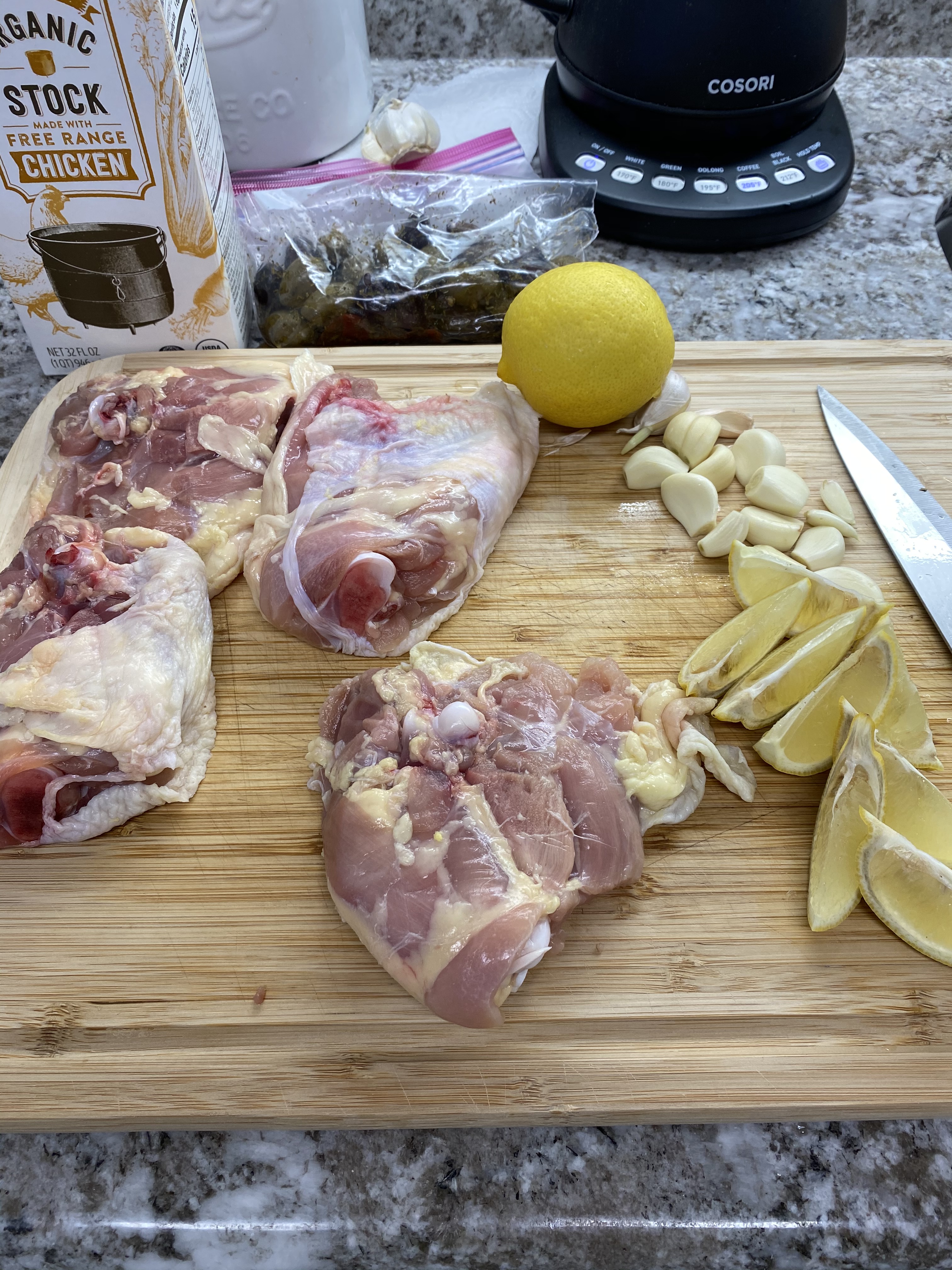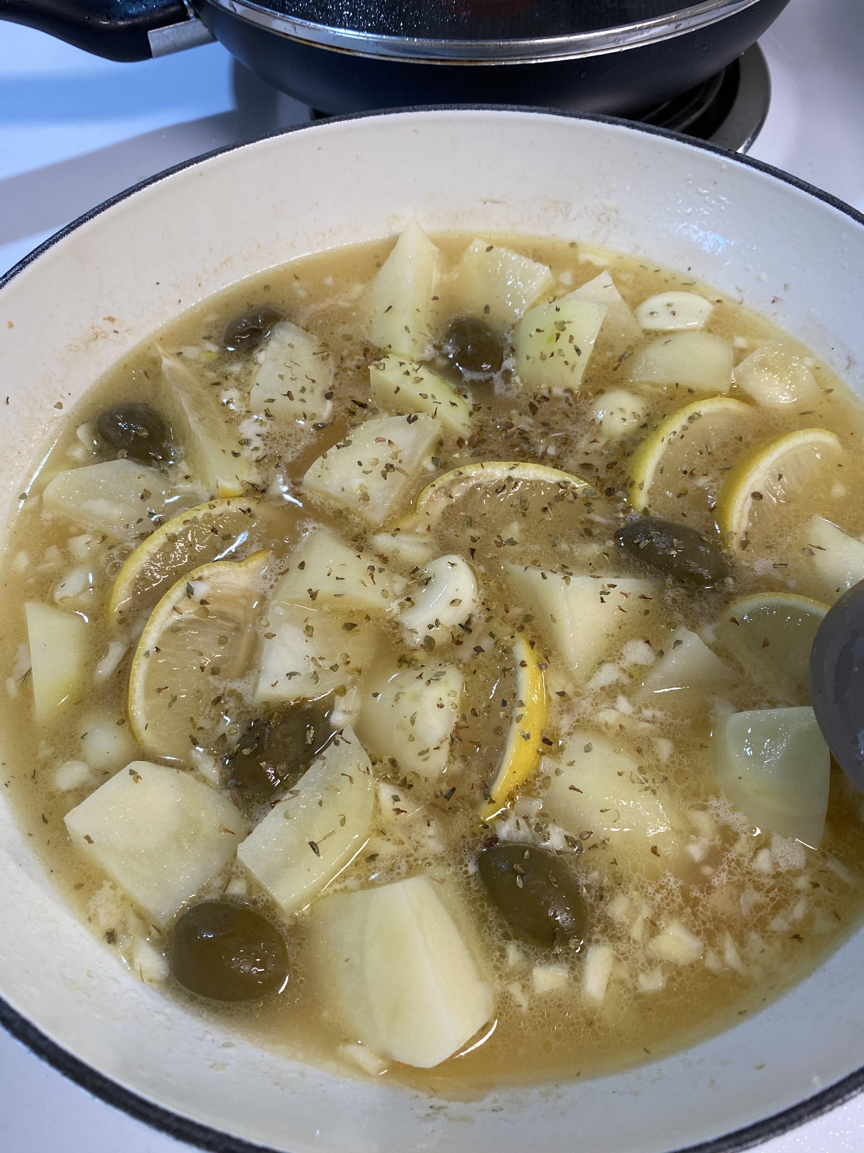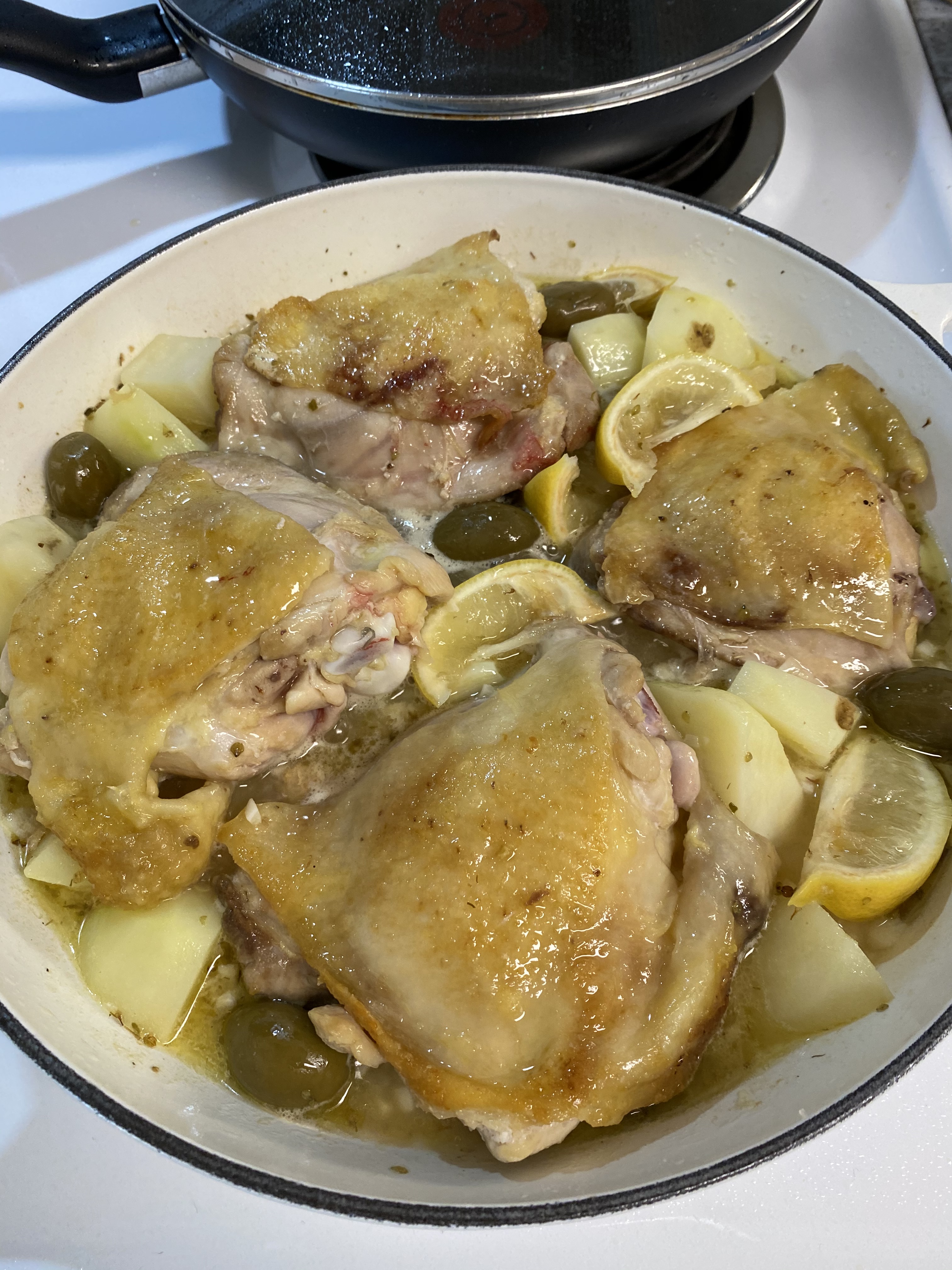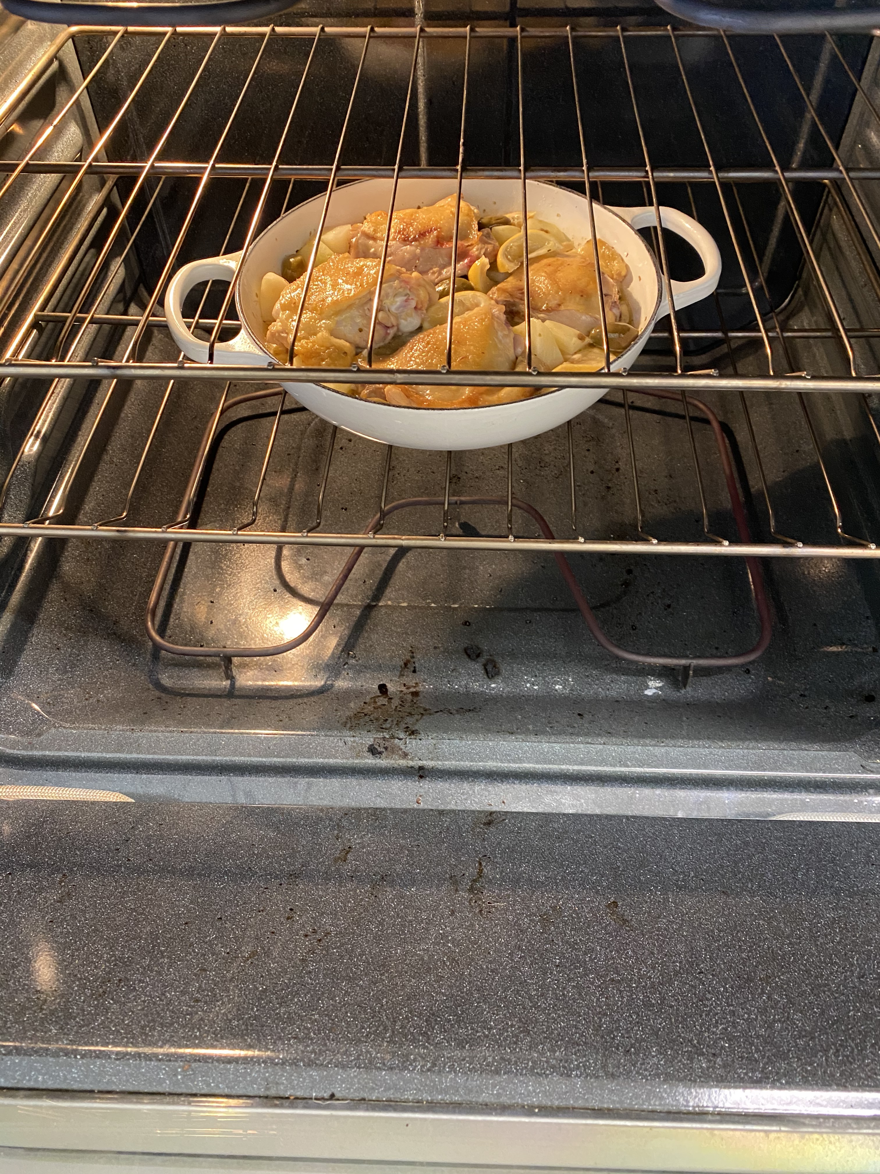 在同一個鍋中到入雞高湯、少許的鹽、馬鈴薯塊,湯汁滾了繼續放入蒜粒、綠橄欖、檸檬片、乾燥百里香,一起燉煮到再一次滾。滾後再放入剛剛煎好的雞肉,放入預熱445 ℉的烤箱,烤30分鐘。(書中有提到最後可以用玉米粉讓湯汁更濃稠,但我因為覺得這樣已經很濃郁了,所以這步驟省略)
