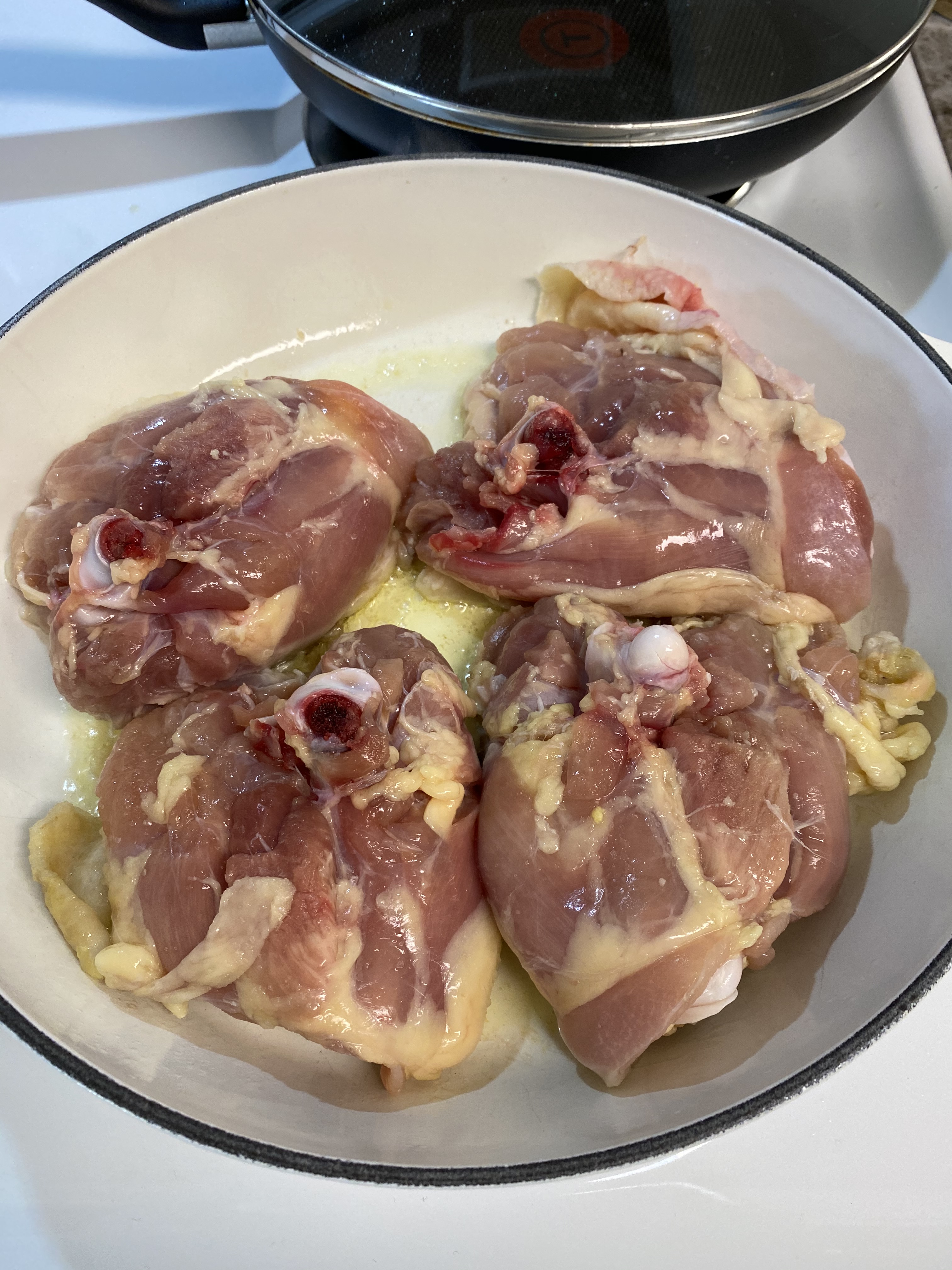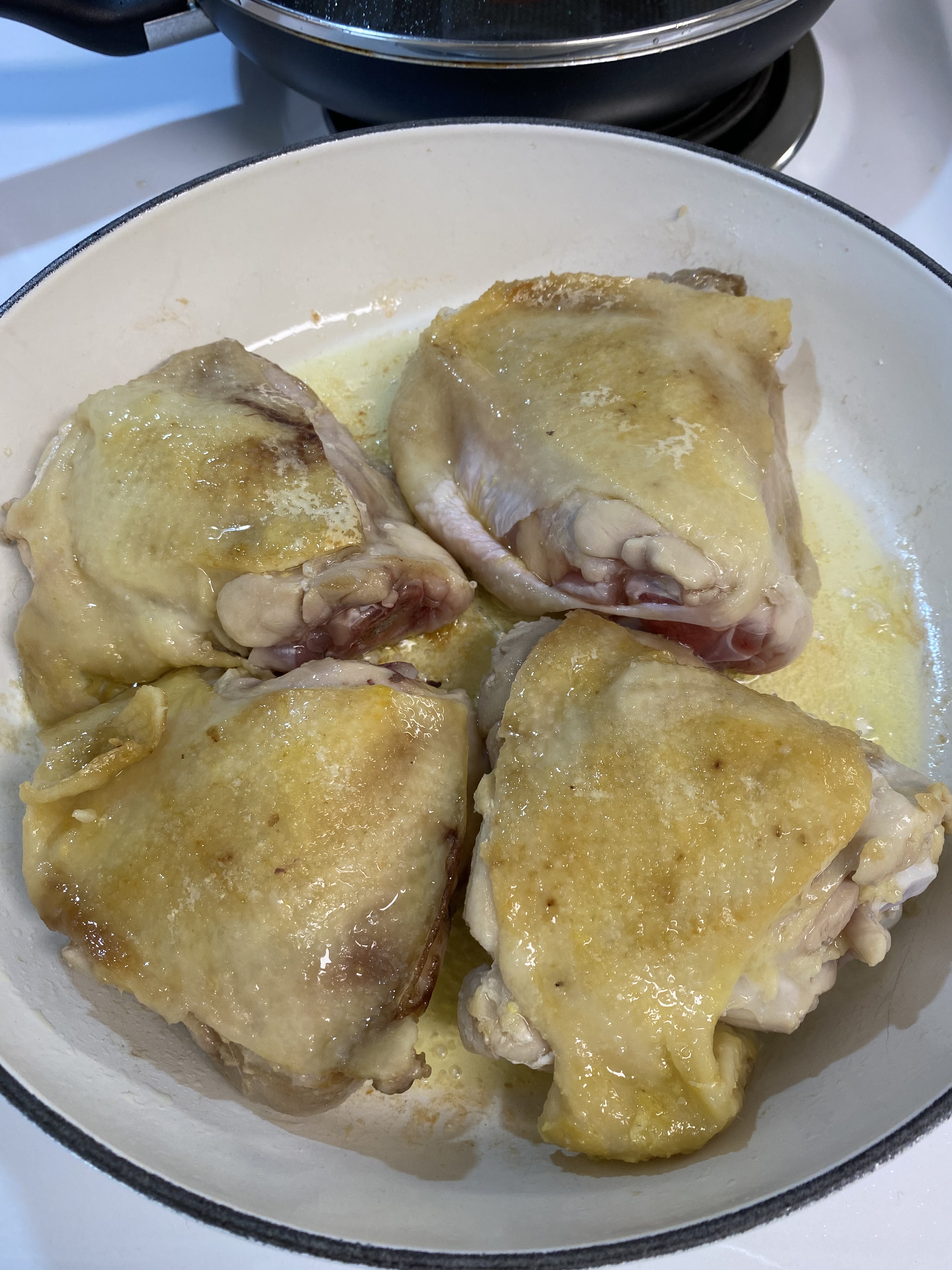 把帶骨雞腿肉洗淨,檸檬切片備用,在鑄鐵鍋中倒入少許橄欖油熱鍋,雞皮朝下放入鍋中煎,煎至金黃再換背面繼續煎,煎至表面熟了先取出備用。