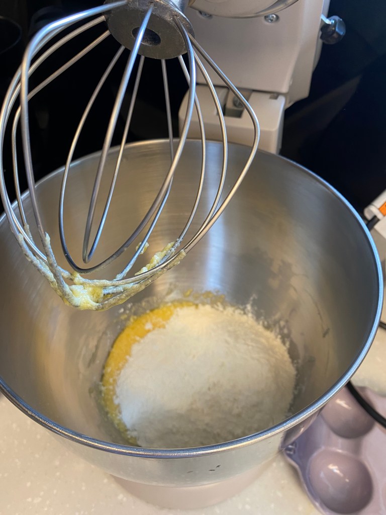 發酵的同時可以來做菠蘿皮,先換一個攪拌機的頭,把高筋麵粉、軟化的奶油、蛋、砂糖一起放入盆中中低速打均勻。