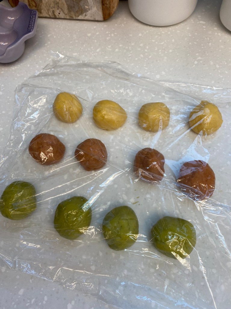 再其中兩個麵團放入抹茶粉與草莓粉 (我的草莓粉顏色比較暗~) ,把顏色和均勻,再把每種顏色的麵團分成四等份,每個大約20克,保鮮膜蓋上備用。