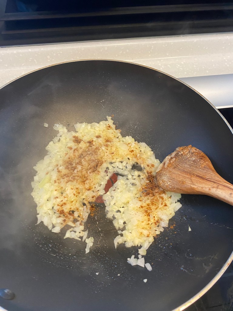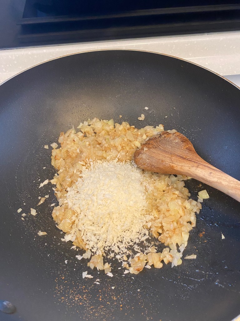 鍋中放入奶油、將洋蔥、蒜末都放入鍋中炒香,再撒入五香粉、白胡椒粉、鹽拌炒均勻。