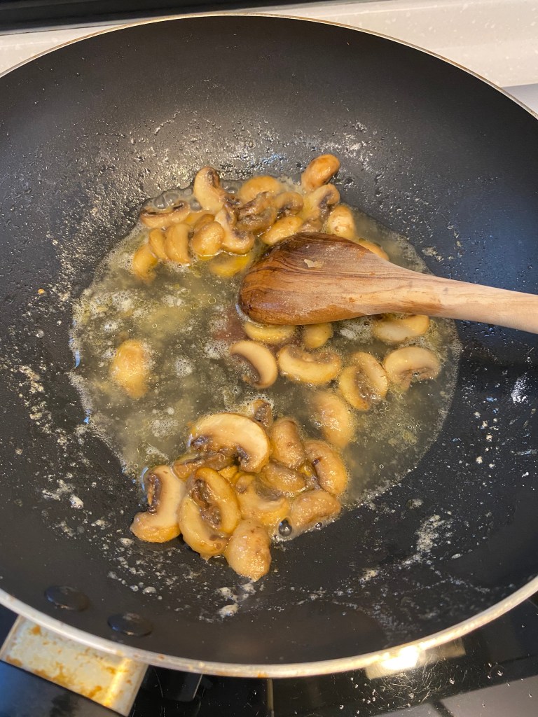 原鍋不用洗,再放入一小塊奶油,將蘑菇放入鍋中拌炒3分鐘左右,放入中筋麵粉攪拌均勻至沒有顆粒,再倒入雞高湯混合。