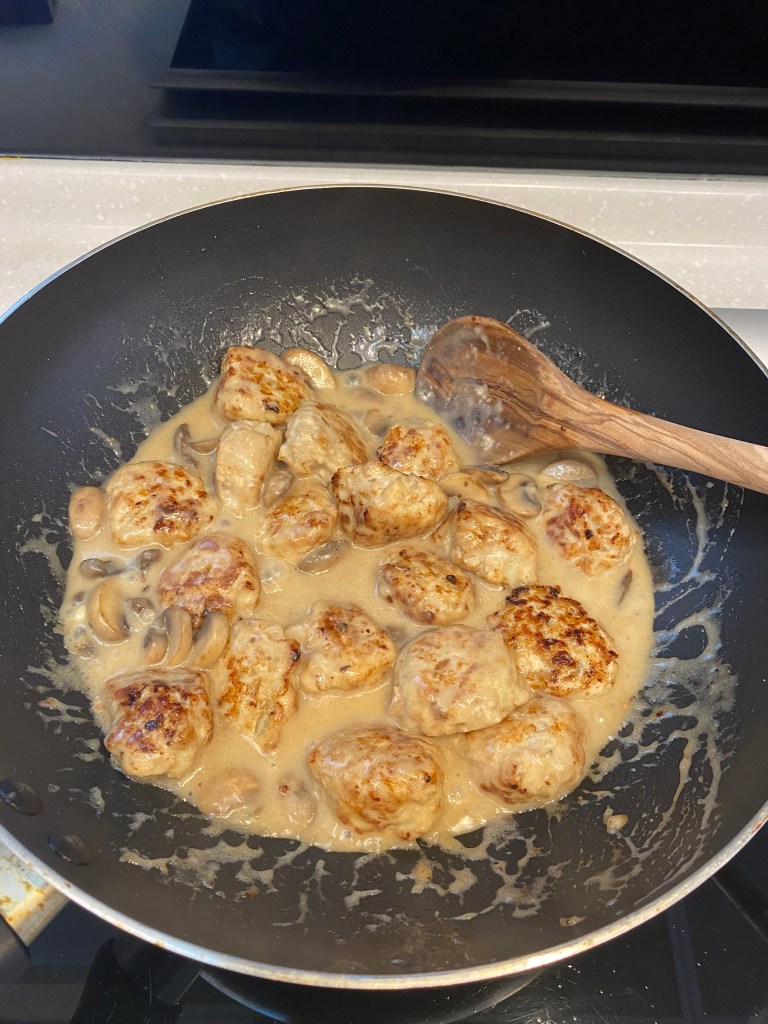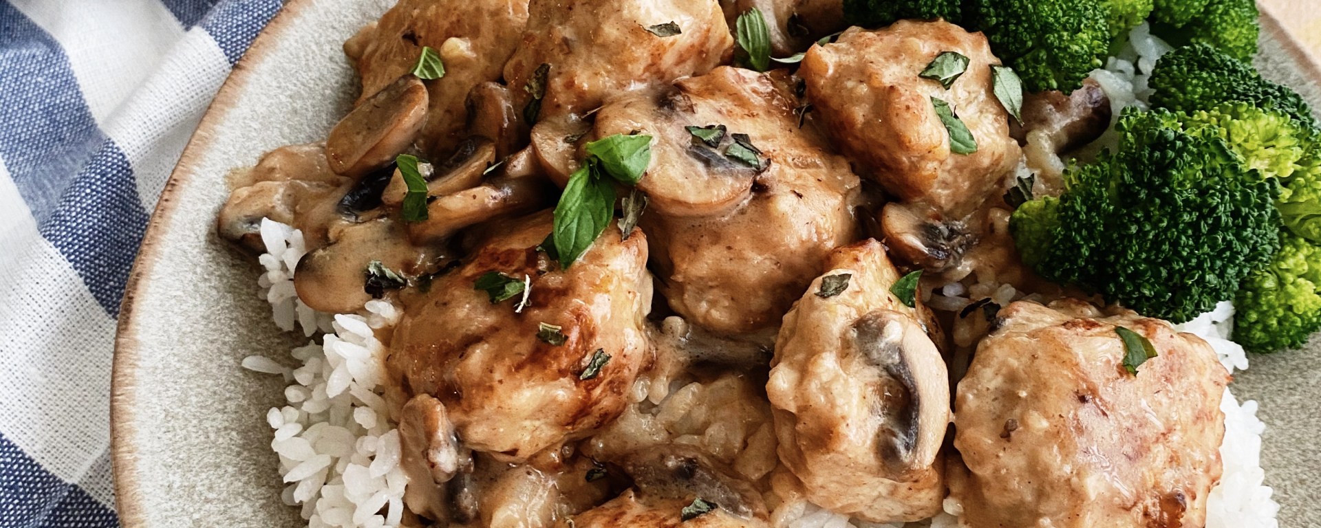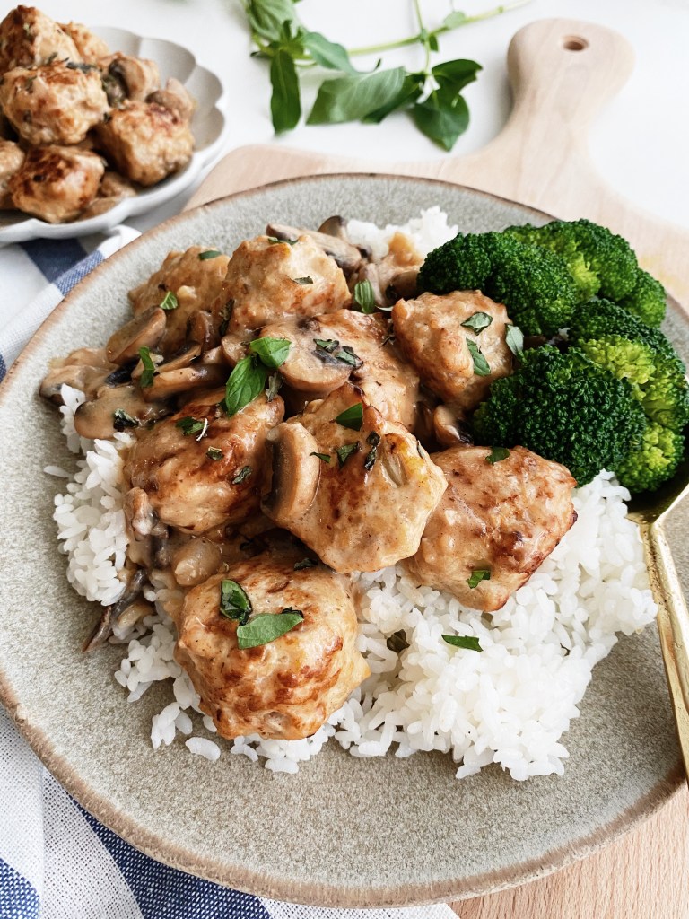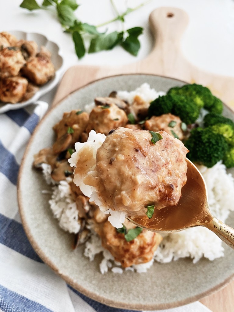 今天一樣做快速料理,就不做中式悶燉的料理,我選擇做成雞肉丸飯,較西式的口味和做法,我加了蘑菇、奶油和麵粉做成了醬汁,一口混合香料的雞胸肉丸、搭配淋在白飯上的濃稠蘑菇醬,和灑上的九層塔葉,味道渾厚香氣十足!