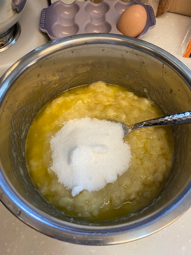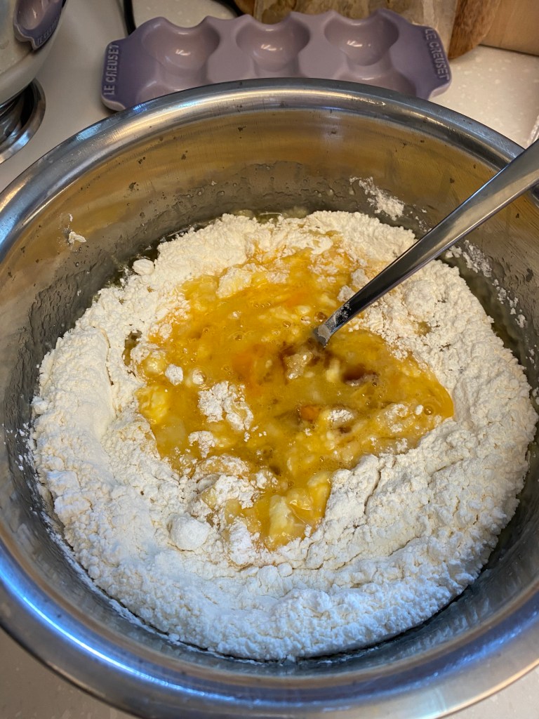 再倒入過篩的中筋麵粉、打散的兩顆蛋、泡打粉、香草精、鹽、一起攪拌均勻。