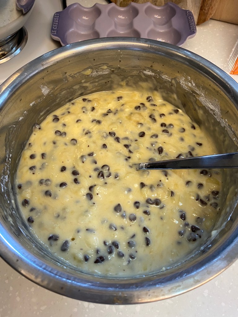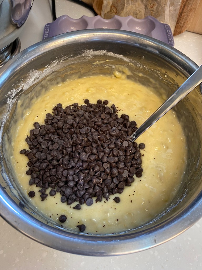 再把巧克力豆都倒進麵糊中 (水滴狀的巧克力豆好難找阿,跑遍超市都沒有賣,最後還是用從美國帶回來的~)。