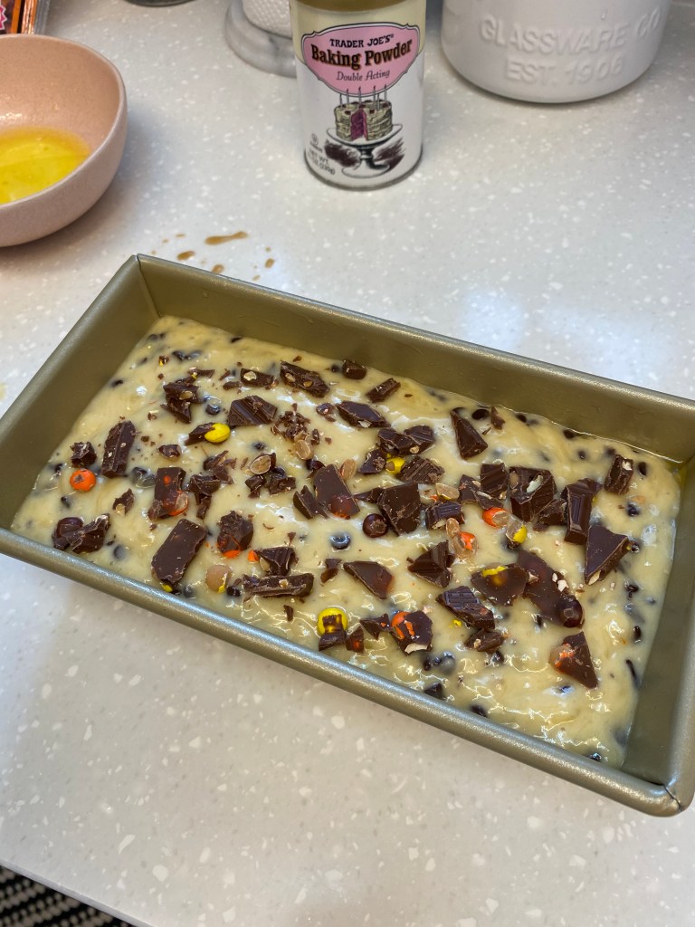 放入刷過油的模型中,將麵糊倒入模型中,最上放可以再灑上一點切過的巧克力碎片,這邊我用的是hershey’s跟reese’s的巧克力,真的無敵好吃~~
