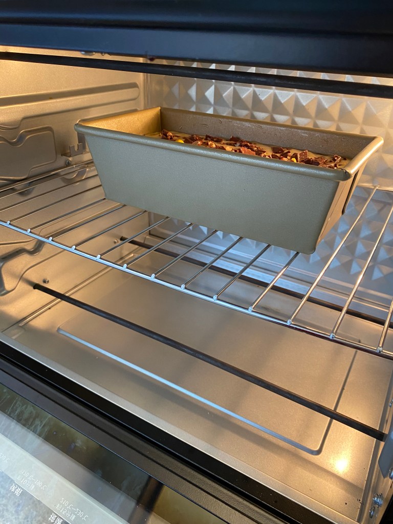 接著把蛋糕放進預熱好的烤箱180°C烤50分鐘!剩最後五分鐘時可以把烤箱調成上方管受熱模式,讓表面的巧克力更融化一些。