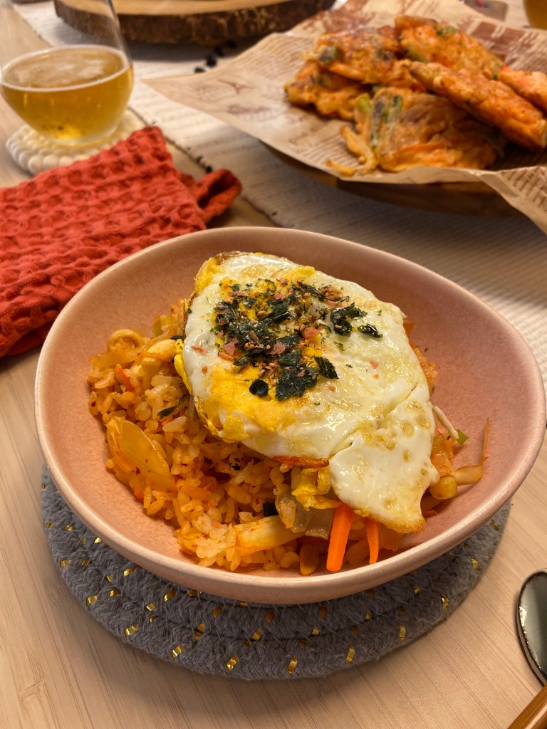 第一次做小飯超簡易的泡菜炒飯沒有什麼技巧,用紅蘿蔔絲、蒜末、泡菜炒香、再把冰箱隔夜白飯放入鍋中一起拌炒,稍微調味就可以,最後再煎一顆荷包蛋、灑上海苔,完成!