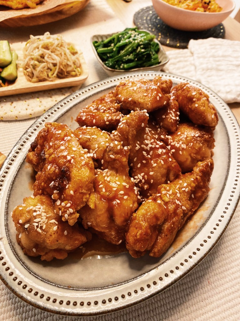 我用超市買的去骨雞腿肉,先用蒜泥、薑末、鹽、黑胡椒、牛奶醃漬一晚,隔天用地瓜粉+高筋麵粉下鍋煎,煎好取出,用番茄醬、白醋、砂糖、麻油調成醬汁,裹著每一塊煎好的炸雞,灑上白芝麻就完成了!
