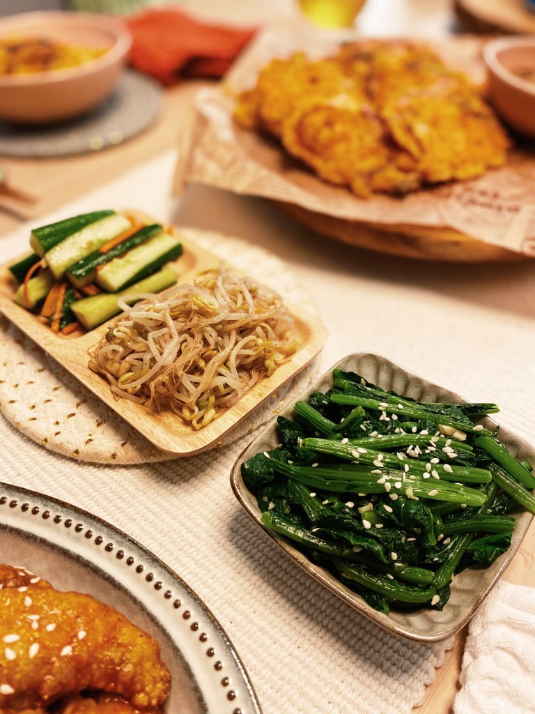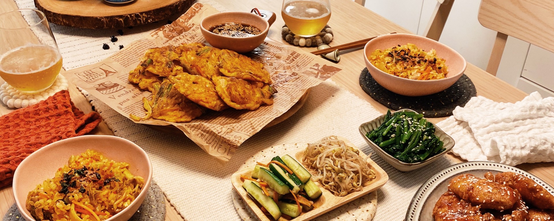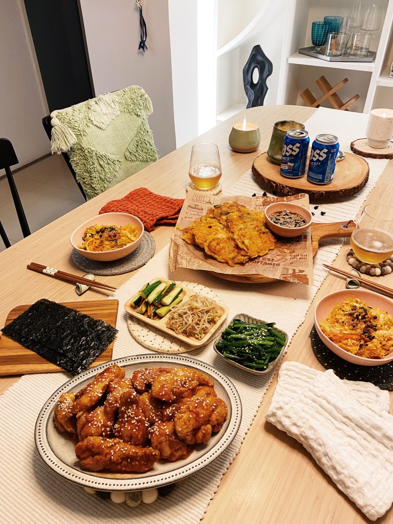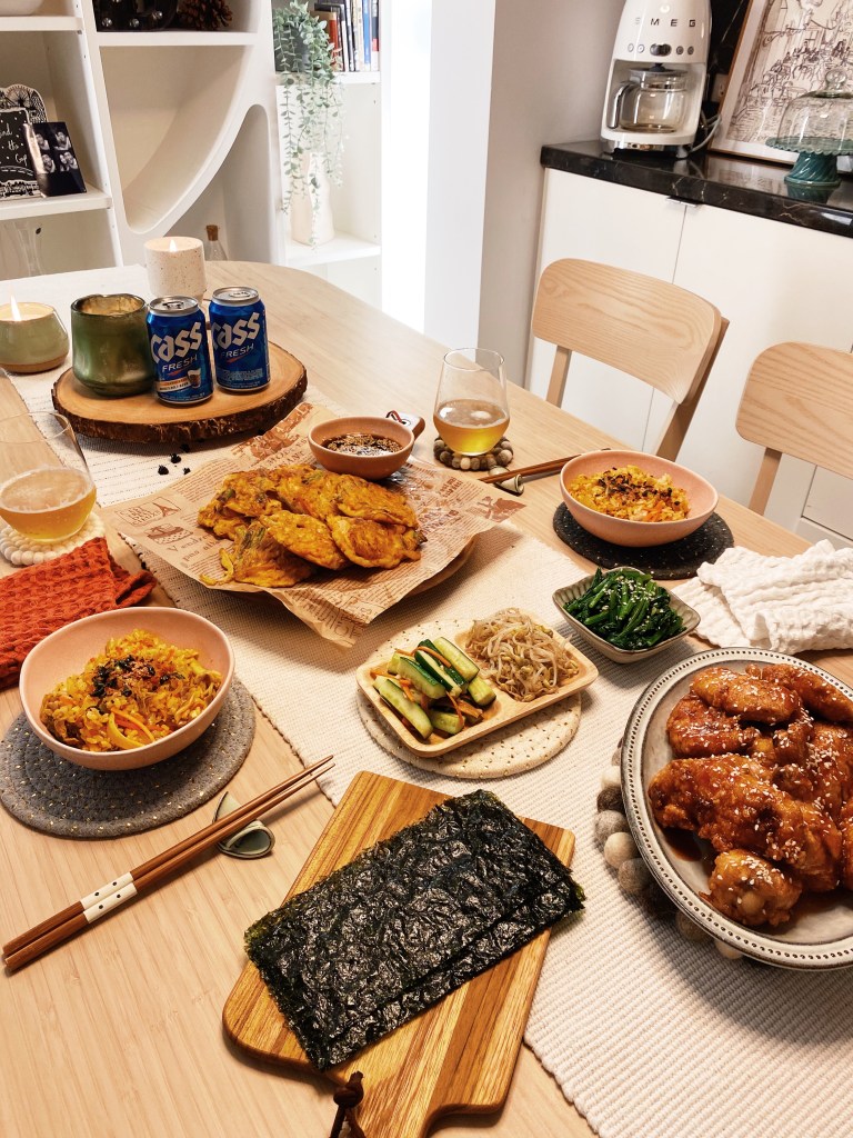 上週六晚上我們家的主題是韓式料理之夜🇰🇷,想想自己最愛吃的幾道韓式料理,不外乎韓式炸雞、韓式煎餅,本來想做個豆腐鍋,但天氣實在太熱所以作罷,改成每次去韓國餐廳必備的小菜!(我也跟餐廳一樣可以續小菜哦☺️)、再來個小碗的泡菜炒飯、海苔配上韓國cass啤酒,儼然我們家就是個小型的韓國餐廳🇰🇷🇰🇷