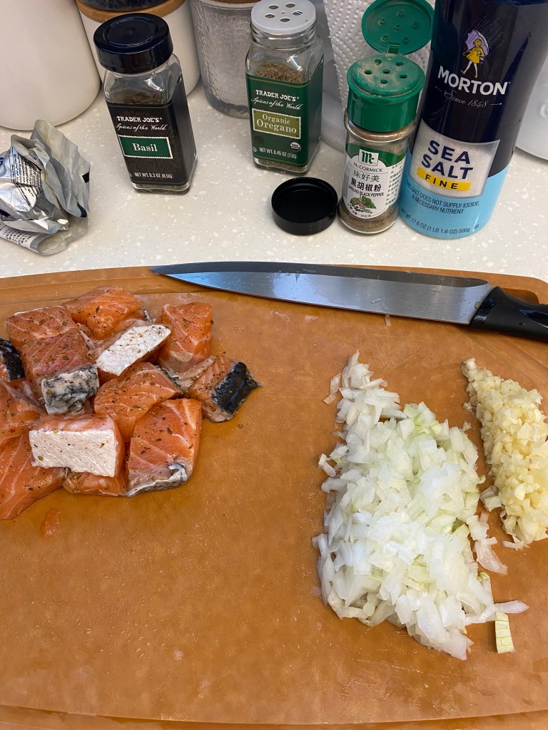 將鮭魚切方塊狀,撒上鹽、奧勒岡葉、黑胡椒抓醃,洋蔥、蒜頭切末備用。