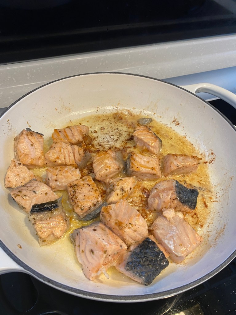 在鍋中放入奶油,將鮭魚塊煎至表面金黃後取出備用。