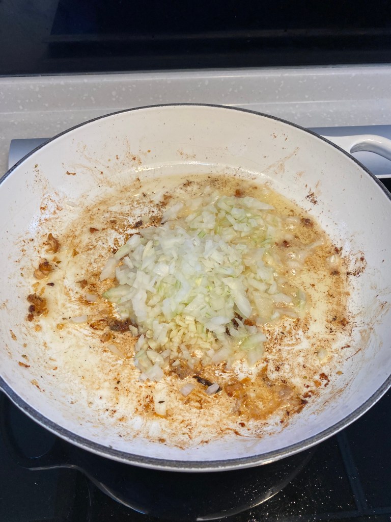 在原鍋中放入洋蔥和蒜頭末拌炒至香。