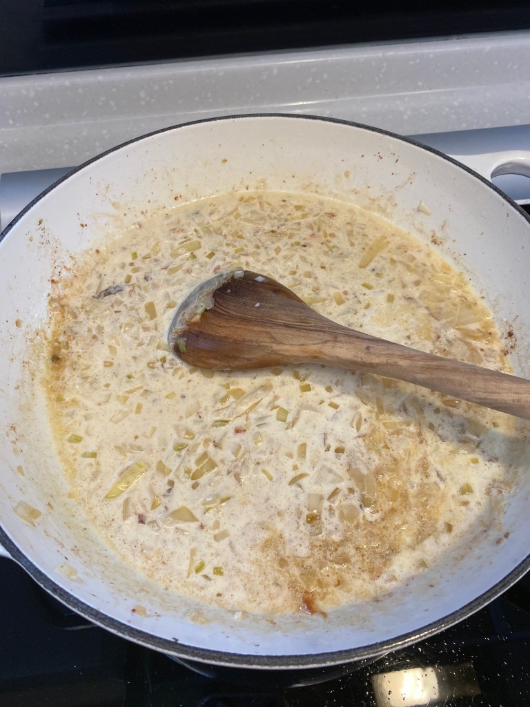 接著倒入米酒、擠半顆~一顆檸檬汁煮1分鐘,再倒入鮮奶油繼續攪拌 (同時在旁邊煮義大利麵等等備用~) 。