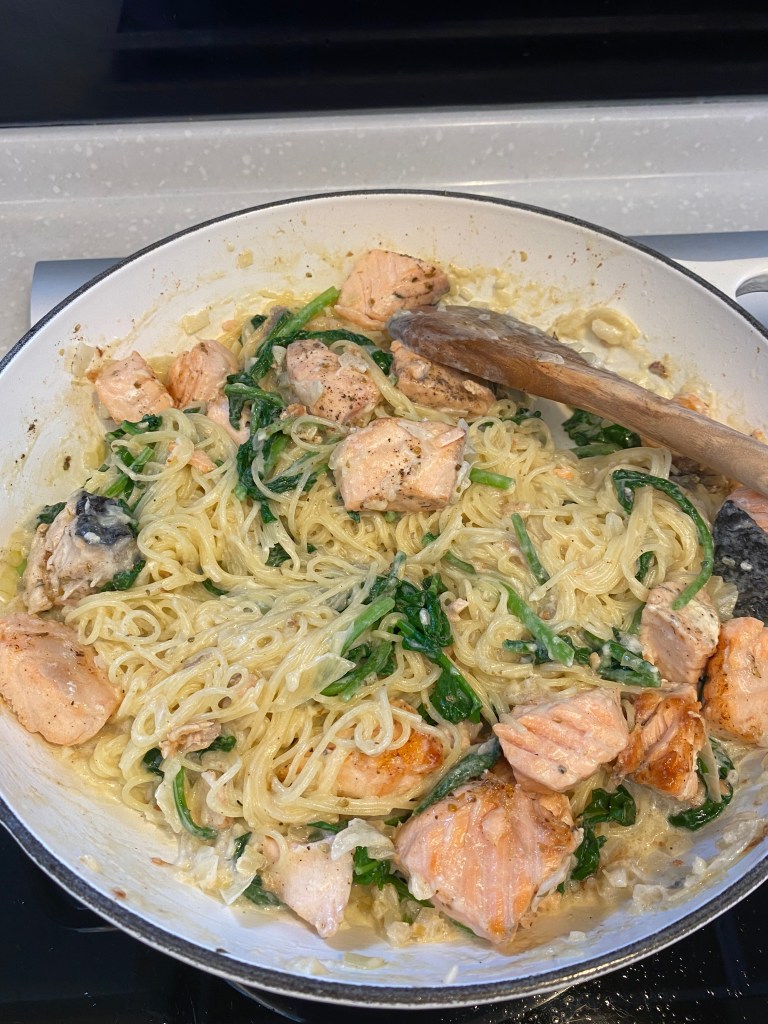 ➔ 把煮好的義大利麵放入鍋中拌均勻,再把鮭魚放回鍋中,把醬汁和配料都拌均勻,白醬鮭魚義大利麵就完成瞜!