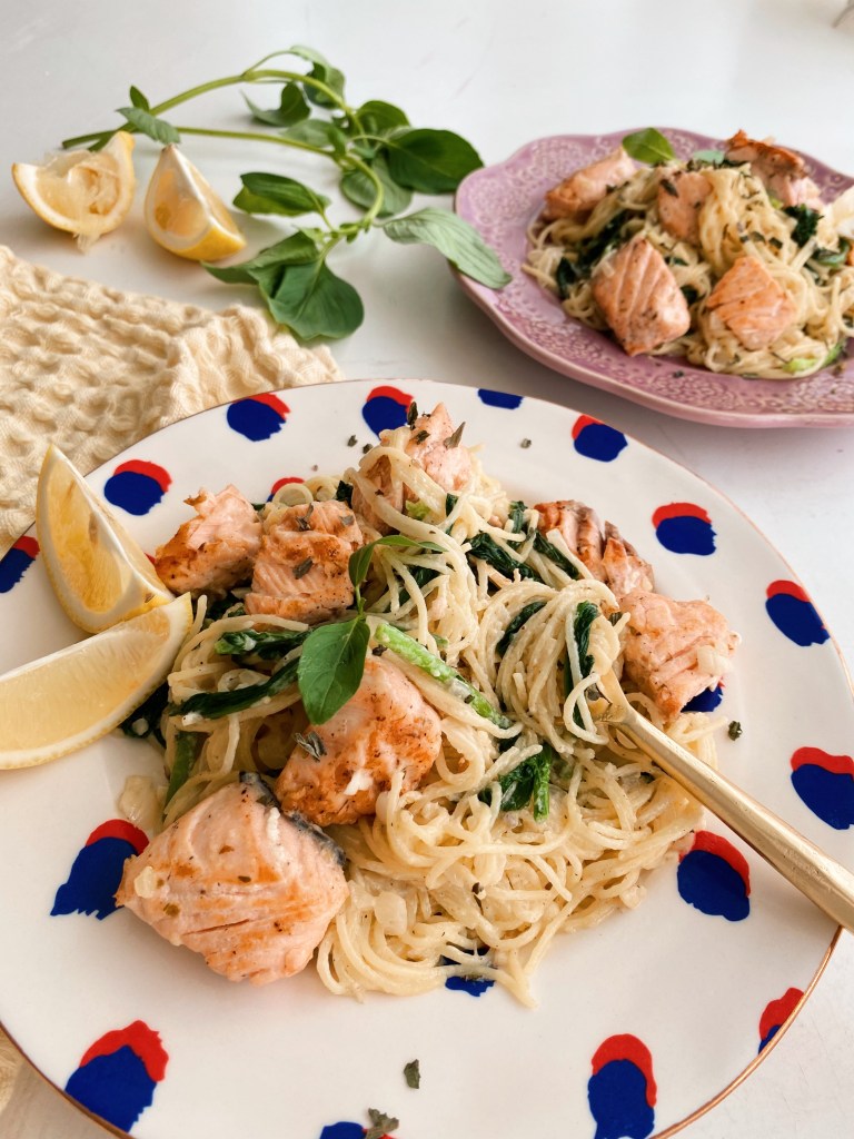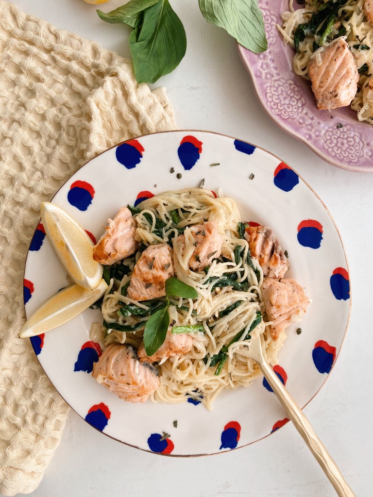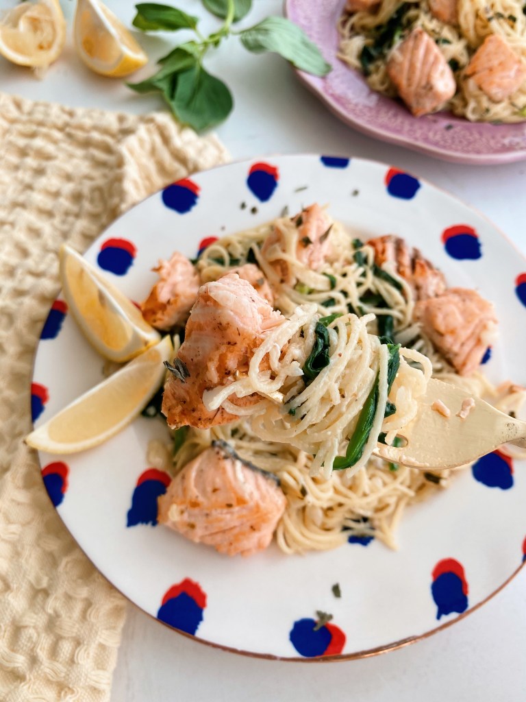 鮭魚除了乾煎之外,加在義大利麵裡也很棒,最近全聯有在賣芝麻葉(看到一次就買一次),我也把它一併加到麵條裏,超級喜歡芝麻葉的清香味,而檸檬汁的酸讓原先奶醬的變的香濃而不膩,新鮮的鮭魚也可以用燻鮭魚替代,也是另一種風味,最後要吃的時候可以再擠一點檸檬,香氣會更十足而且爽口🍋