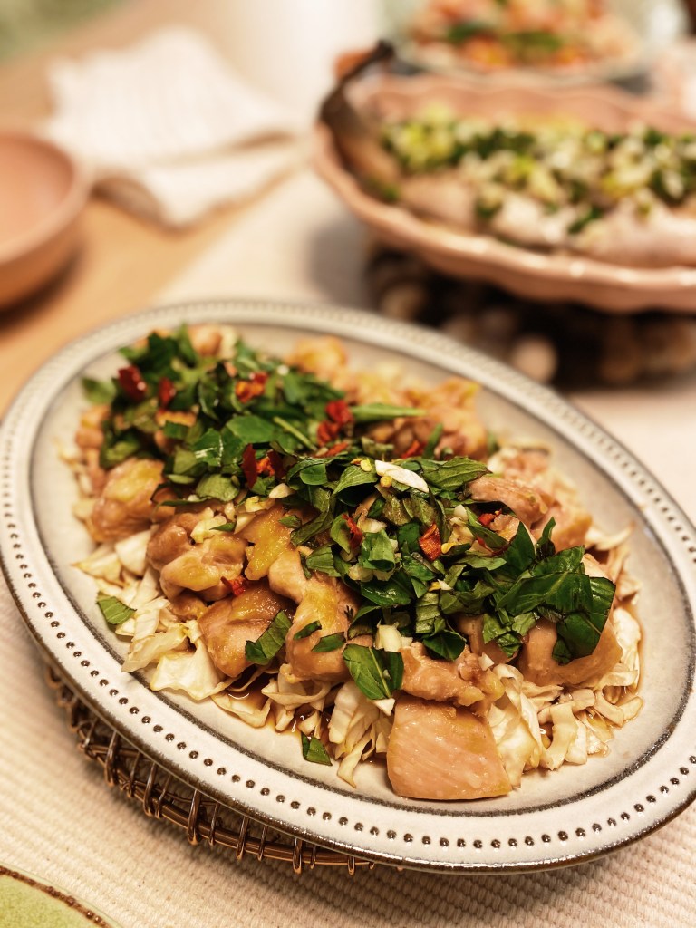 取一個小碗,將辣椒1小根、檸檬1顆、烏醋2匙、砂糖2匙、蒜末、水、鹽少許、混合而成的醬汁 (試試味道,太酸太鹹都可以調整) ,將一半的醬汁淋在高麗菜絲上,放上煎好的雞腿肉、灑上大把的九層塔(有香菜更好)、最後淋上剩下的醬汁,椒麻雞完成!