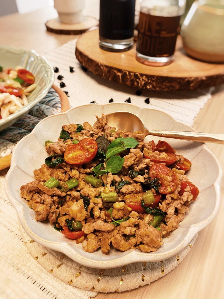 因為在超市沒有豬絞肉,我就用豬肉絲代替,先剁成丁丁和蒜末一起炒香,再將川燙過的四季豆切丁、小番茄一起拌炒,放入醬油、砂糖調味,最後加入大把的九層塔葉一起拌炒熄火,打拋豬完成!