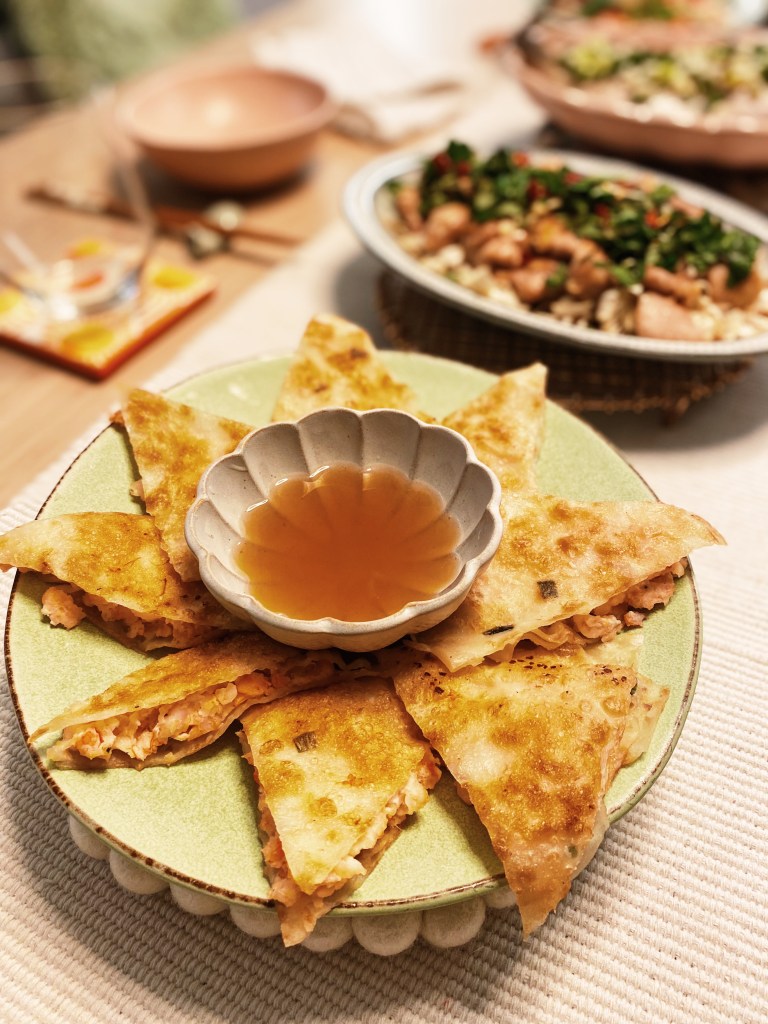 其中難度最高的當然是月亮蝦餅,首先要把大約20隻以上的蝦子剝殼、剁成泥、醃過、放上蛋餅皮、下鍋煎,但我的小心得是蛋餅做起來還是厚了些,下次我再用自己調的麵糊試試看!