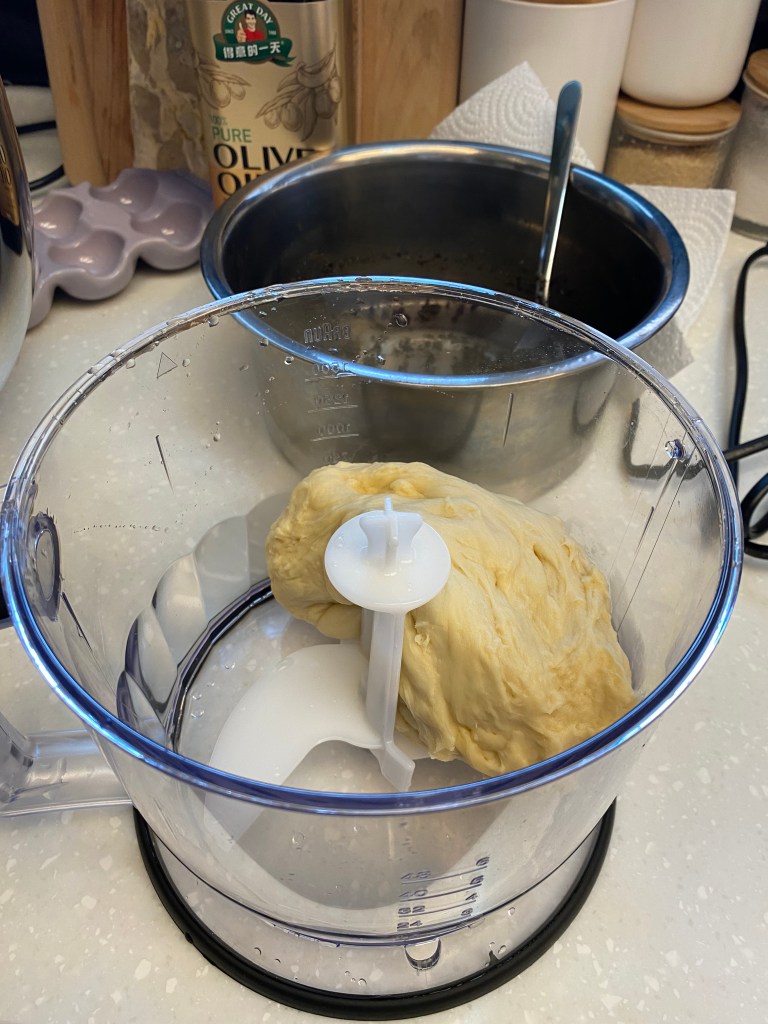 把高筋、低筋麵粉、酵母粉、砂糖、雞蛋、奶油、鮮奶、鹽放進德國百靈BRAUN手持式食物處理機攪拌,蓋子蓋上,將手持式攪拌棒插入,就可以啟動了。